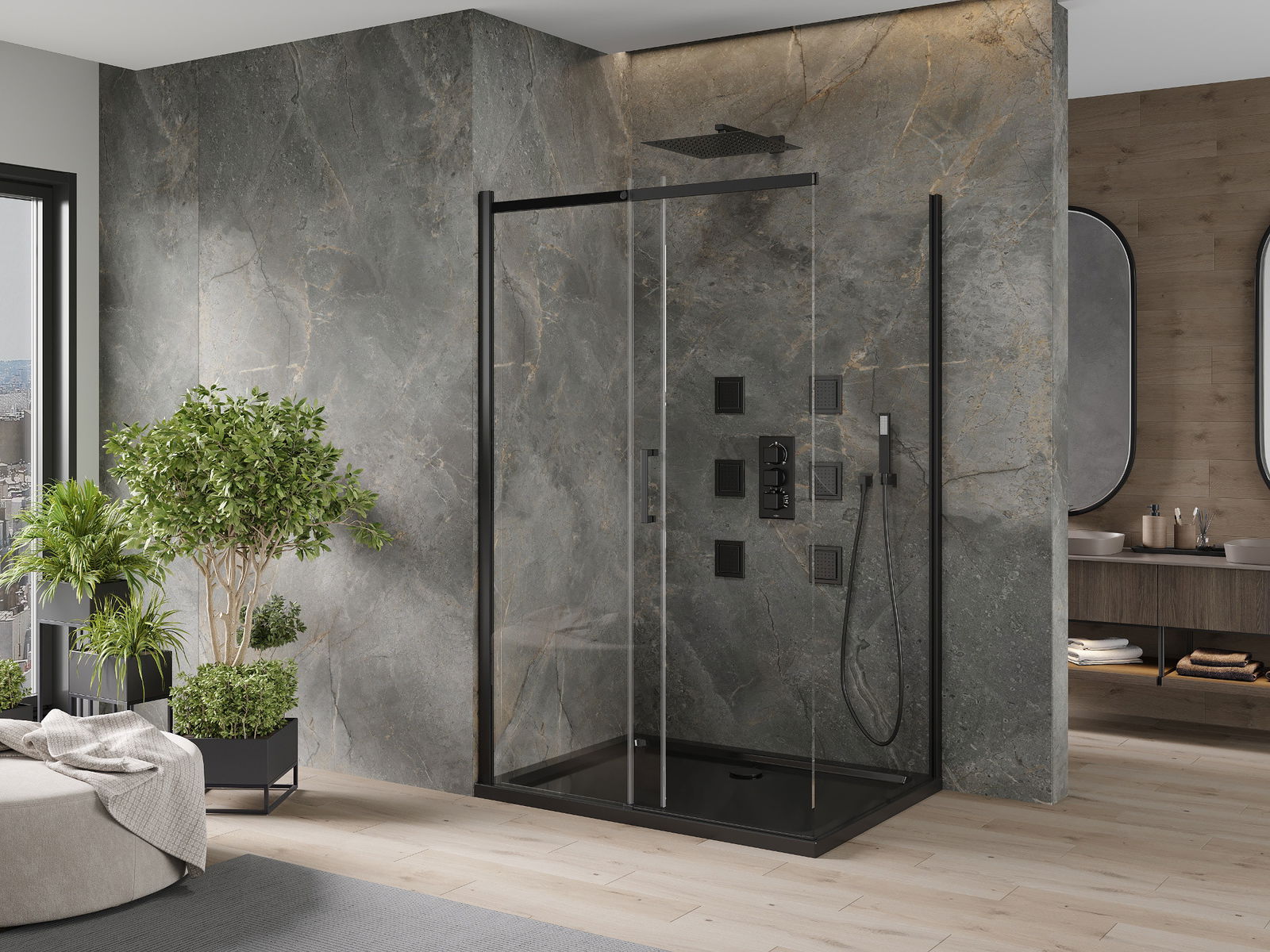 Χάρη στη χρήση ενός καθολικού συστήματος στήριξης, οι πόρτες ντους μπορούν να τοποθετηθούν είτε από τη δεξιά είτε από την αριστερή πλευρά, ανάλογα με τις ανάγκες. Έτσι μπορείτε να σχεδιάσετε με ευκολία ένα ντους προσαρμοσμένο στον χώρο του μπάνιου.