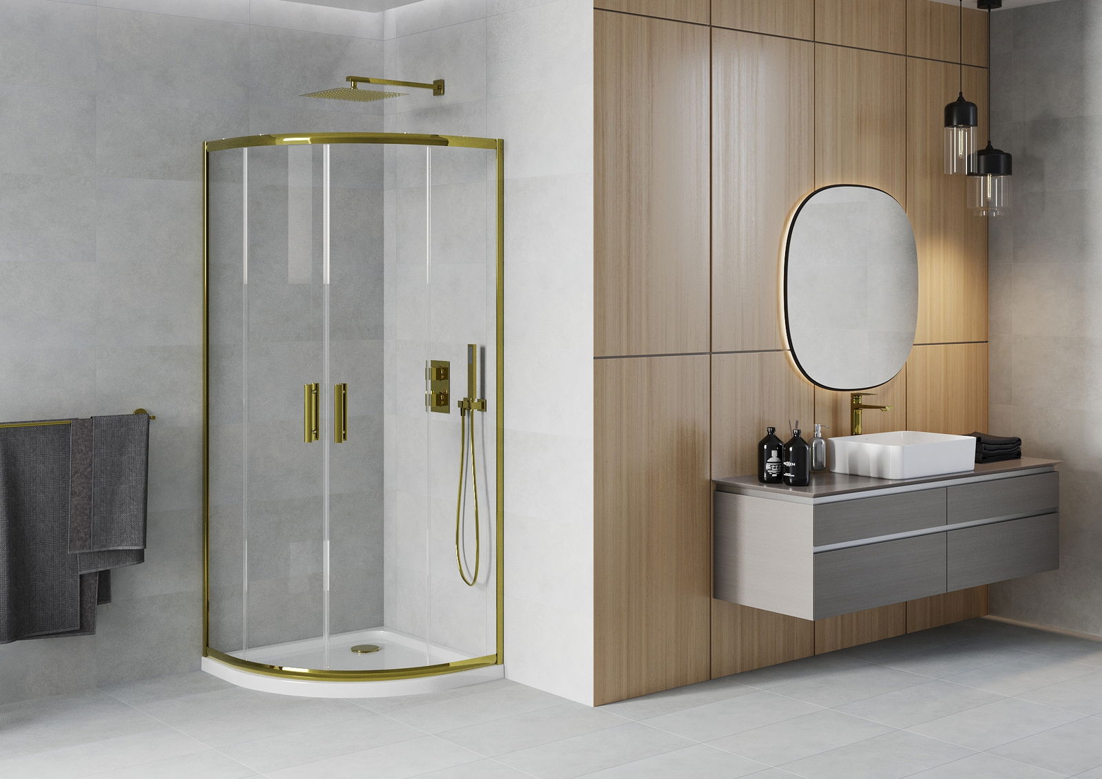Mexen Rio ημικυκλική καμπίνα ντους 90 x 90 εκ., διαφανής, χρυσή + δίσκος Flat,