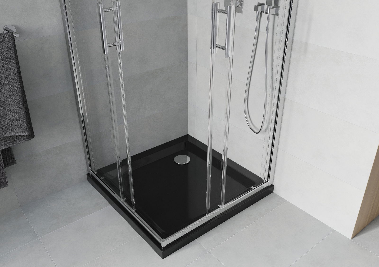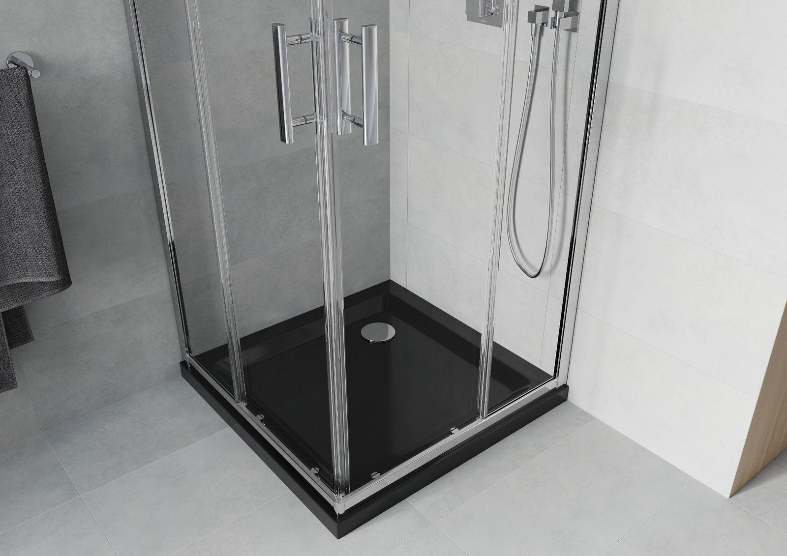 Η πρακτική και άνετη λαβή κατασκευάζεται από ανθεκτικό και αντοχής μέταλλο. Ο μοντέρνος σχεδιασμός σε συνδυασμό με το φινίρισμα που ταιριάζει με το χρώμα των προφίλ προσδίδει στο σύνολο μια σύγχρονη και κομψή εμφάνιση, τονίζοντας την αισθητική κάθε μπάνιου.