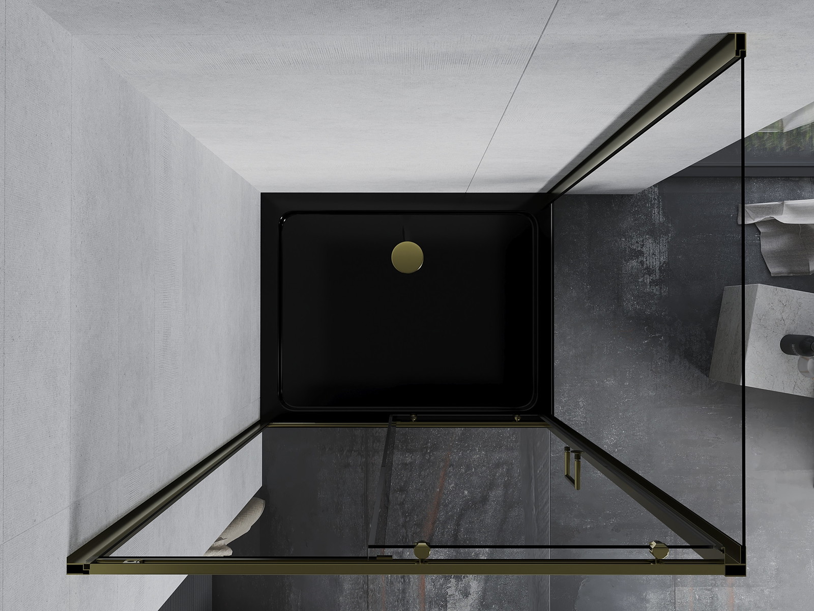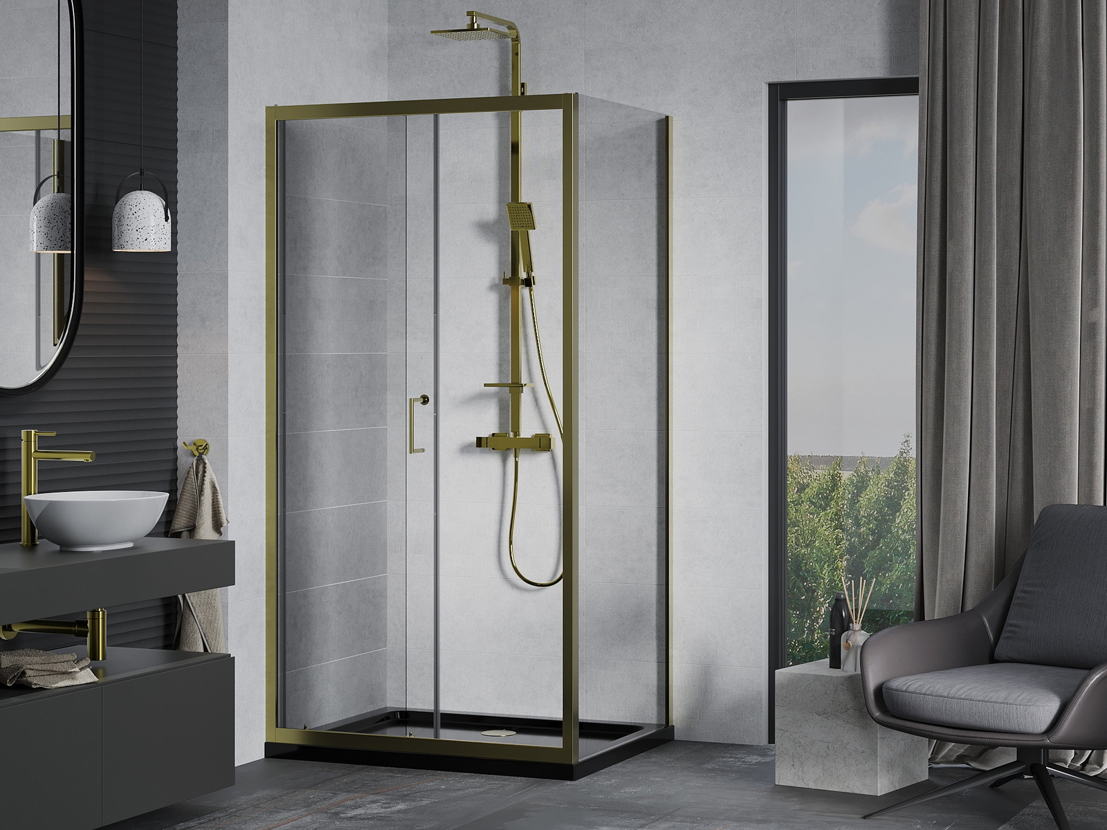 Mexen Apia συρόμενη καμπίνα ντους 140 x 80 cm, διαφανής, χρυσή + ντουζιέρα Flat,