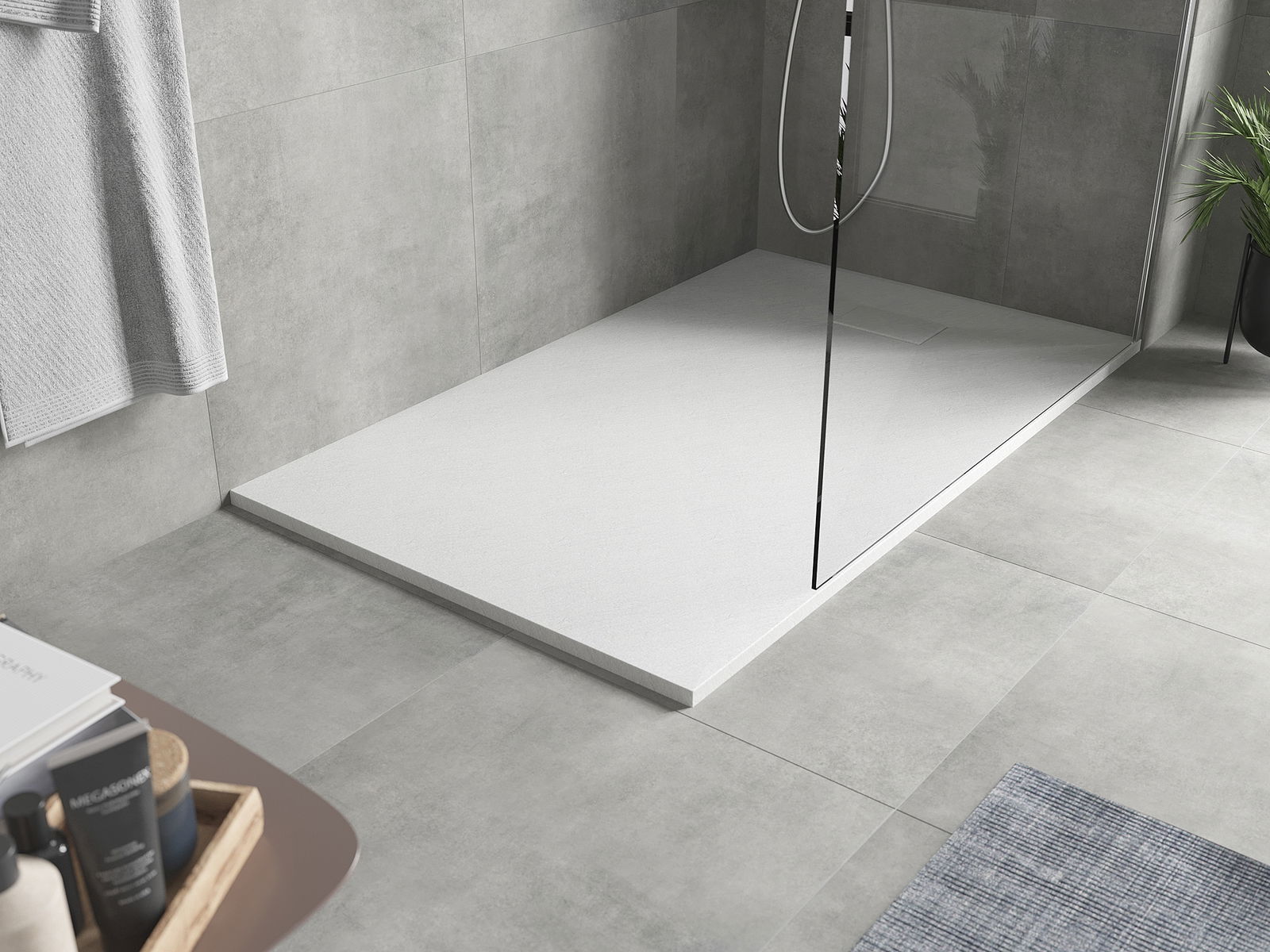 Η επιφάνεια της ντουζιέρας με τη δομή της θυμίζει πέτρα. Αποτελεί έναν εξαιρετικό συνδυασμό φυσικής εμφάνισης με σύγχρονη εσωτερική διαρρύθμιση. Προσθέτει χαρακτήρα, υπογραμμίζει την αισθητική και την κομψότητα της διακόσμησης του μπάνιου και εντυπωσιάζει με τη μορφή της.