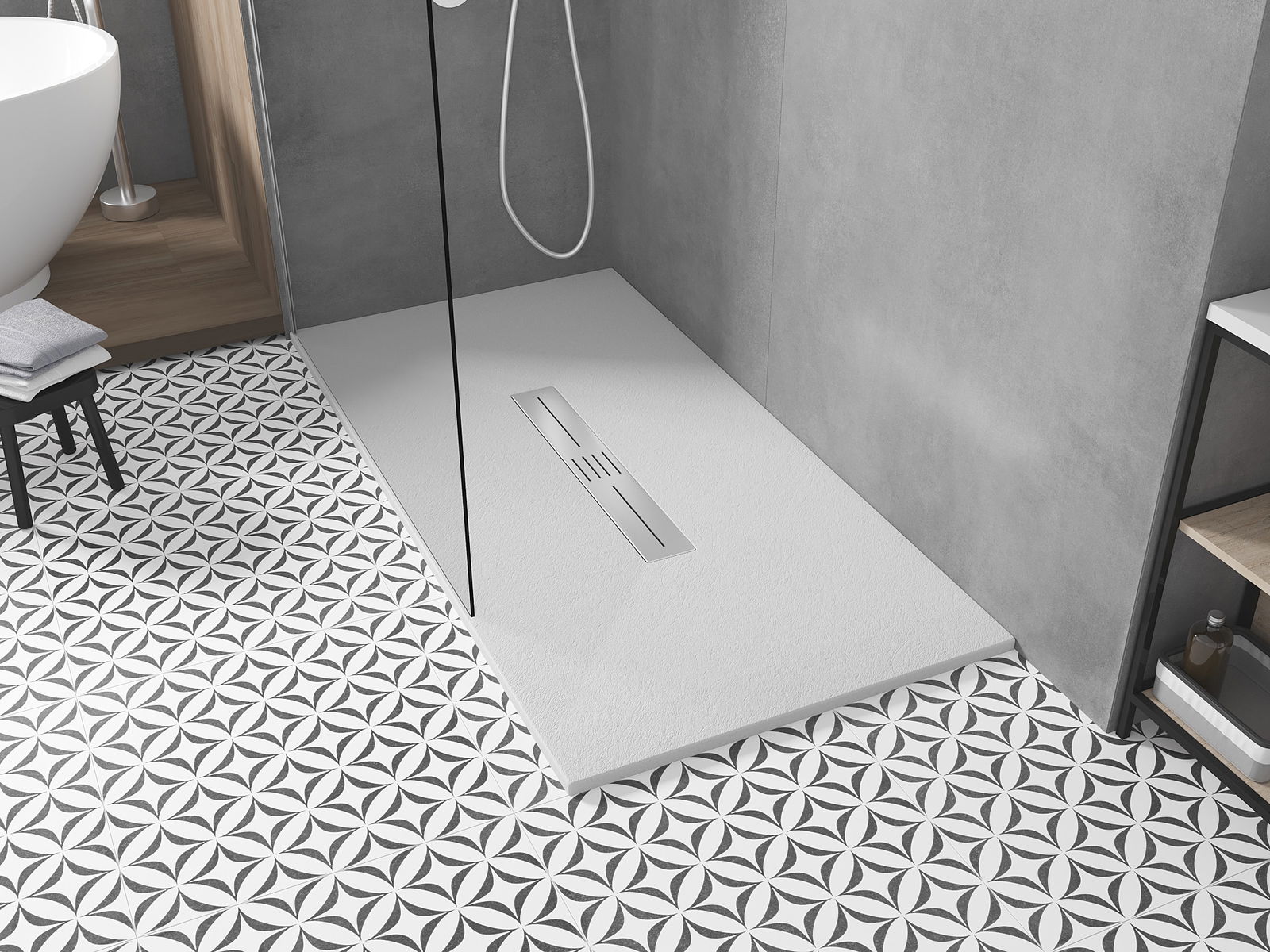 Η επιφάνεια της ντουζιέρας με τη δομή της θυμίζει πέτρα. Αποτελεί έναν εξαιρετικό συνδυασμό φυσικής εμφάνισης με σύγχρονη εσωτερική διαρρύθμιση. Προσθέτει χαρακτήρα, υπογραμμίζει την αισθητική και την κομψότητα της διακόσμησης του μπάνιου και εντυπωσιάζει με τη μορφή της.
