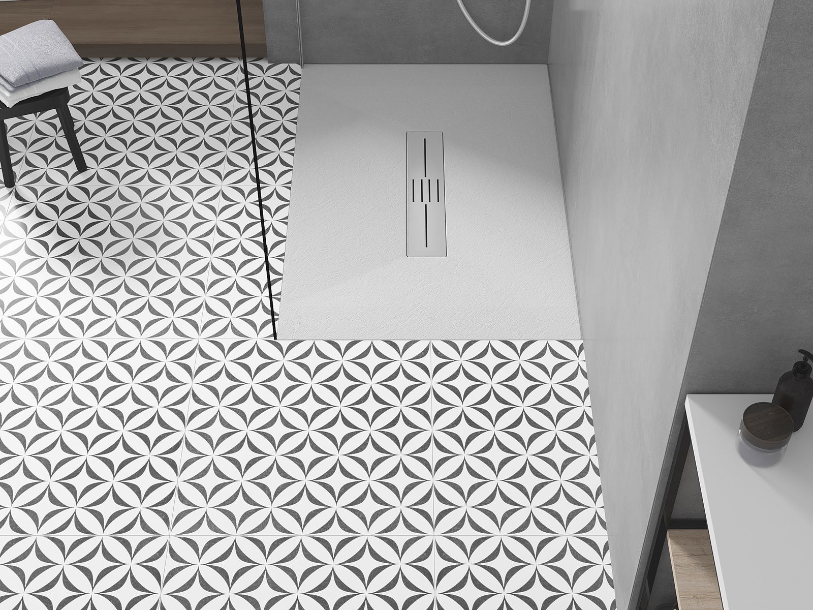 Η επιφάνεια της ντουζιέρας με τη δομή της θυμίζει πέτρα. Αποτελεί έναν εξαιρετικό συνδυασμό φυσικής εμφάνισης με σύγχρονη εσωτερική διαρρύθμιση. Προσθέτει χαρακτήρα, υπογραμμίζει την αισθητική και την κομψότητα της διακόσμησης του μπάνιου και εντυπωσιάζει με τη μορφή της.