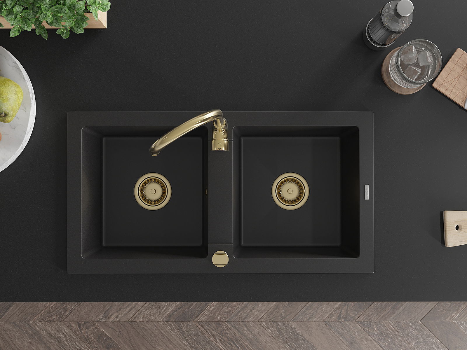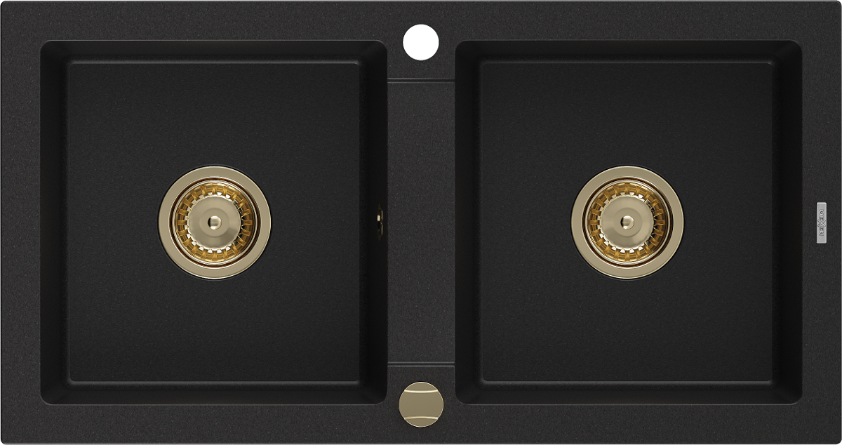 Mexen Mario νεροχύτης γρανίτης 2-θαλάμων 820 x 436 mm, μαύρος, σιφόνι χρυσό