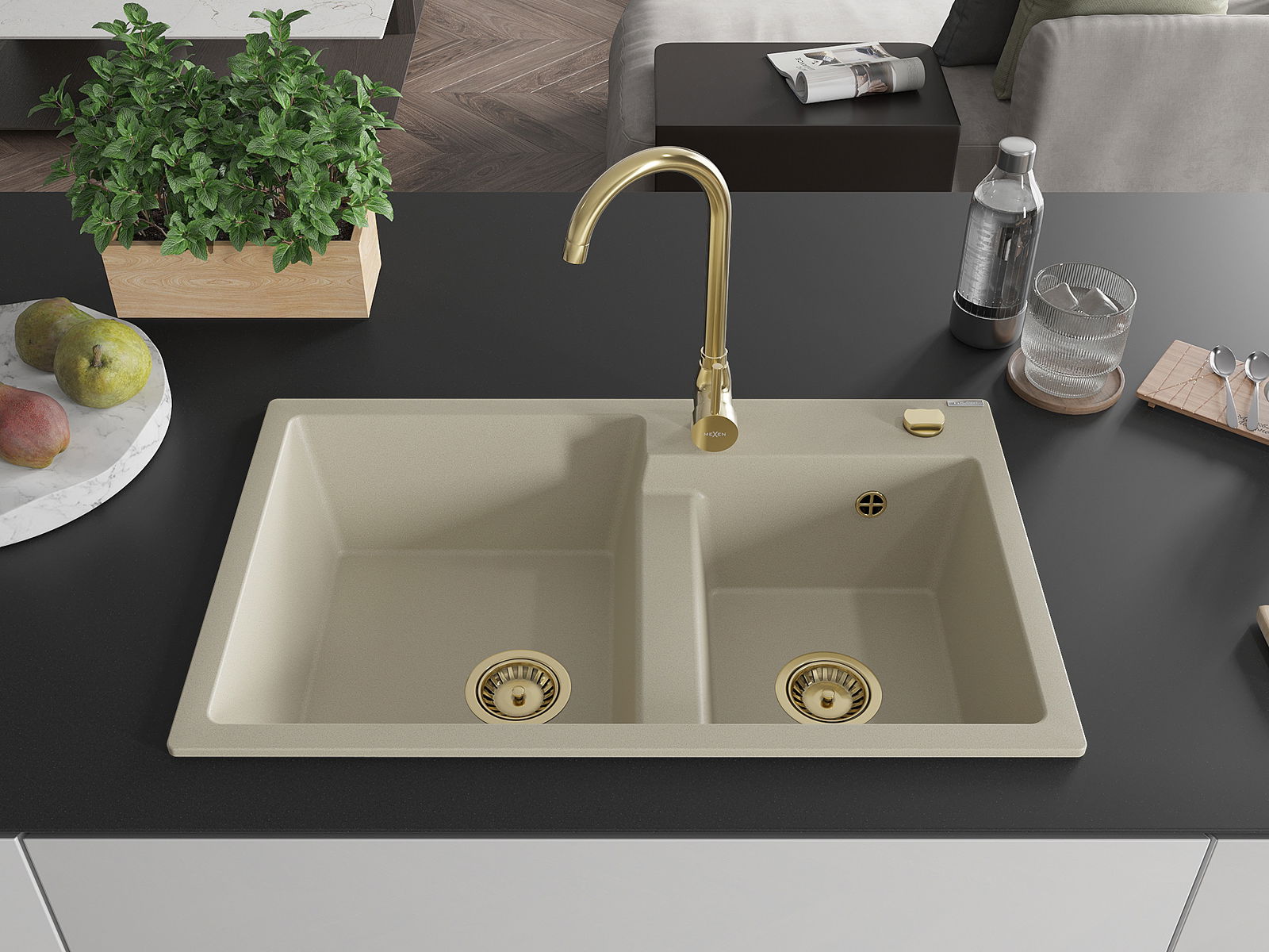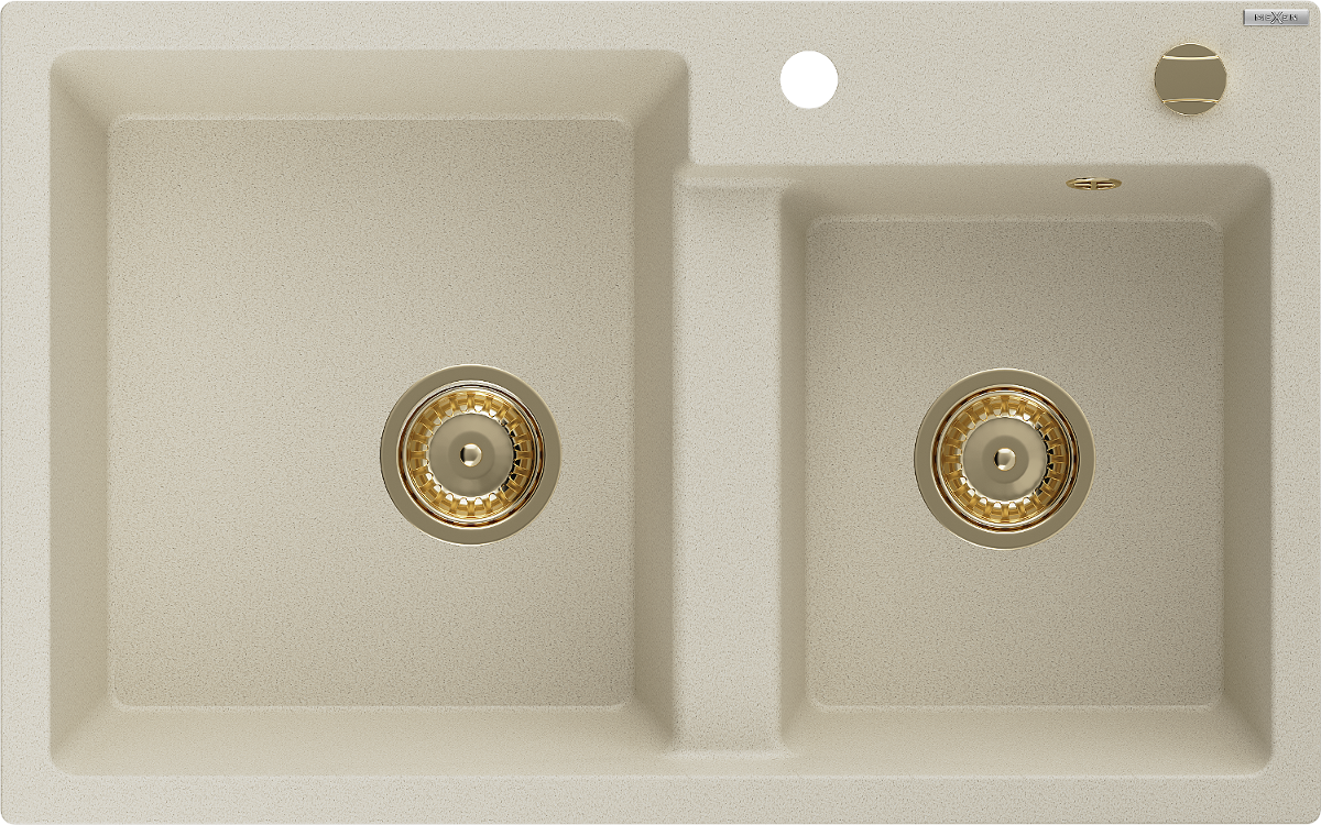 Mexen Tomas νεροχύτης γρανίτη 2 θάλαμοι 800 x 500 mm, μπεζ, σιφόνι χρυσό - 6516802000-69-G