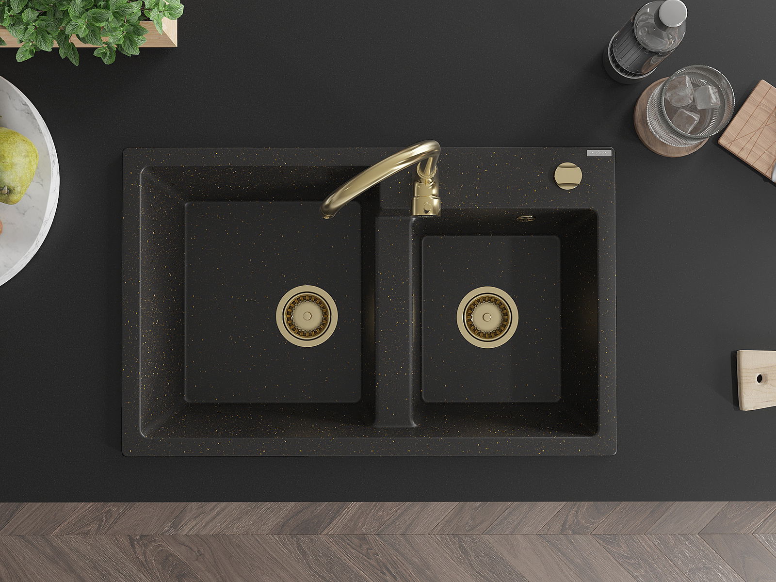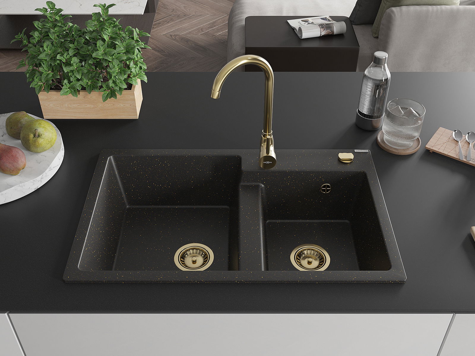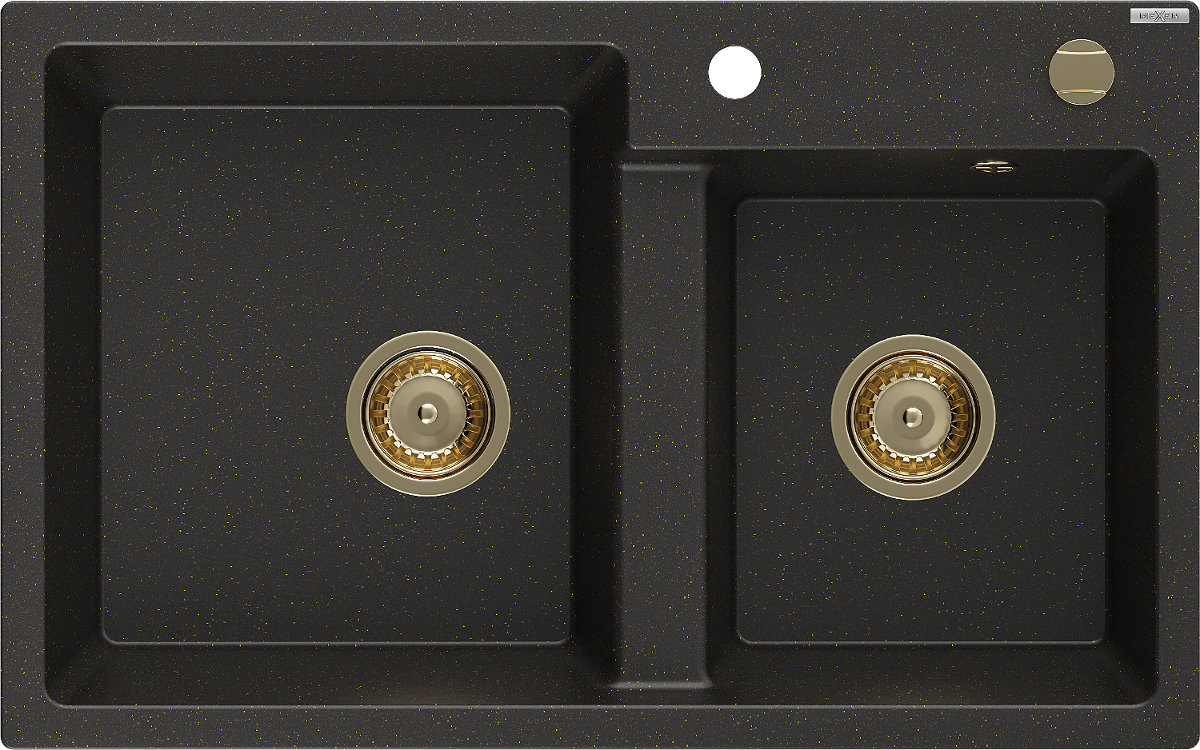 Mexen Tomas νεροχύτης γρανίτης 2-θαλάμων 800 x 500 mm, μαύρο/χρυσό μεταλλικό,