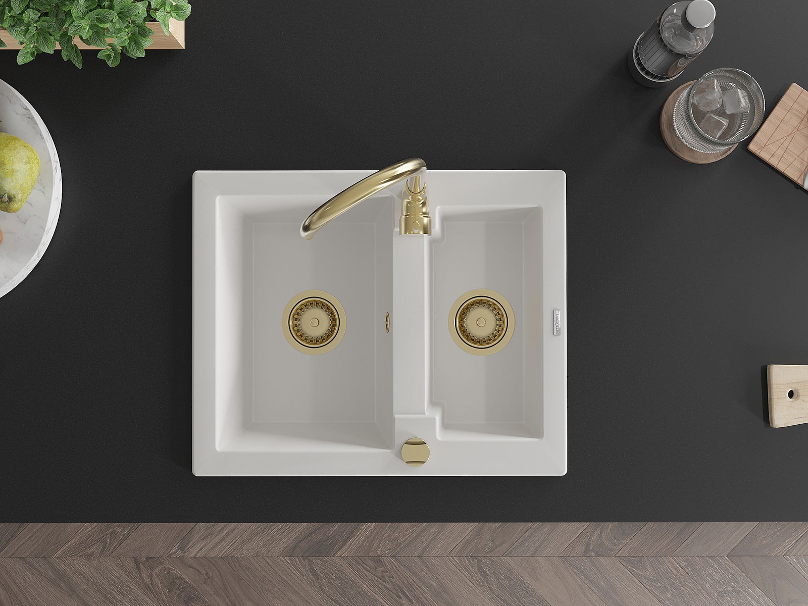 Mexen Carlos νεροχύτης γρανίτης 1,5-θαλάμων 582 x 475 χιλιοστά, λευκός, με χρυσό