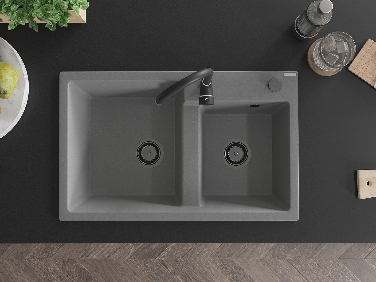 Mexen Tomas νεροχύτης γρανίτης 2 θαλάμων 800 x 500 mm, γκρι, μαύρο σιφόνι