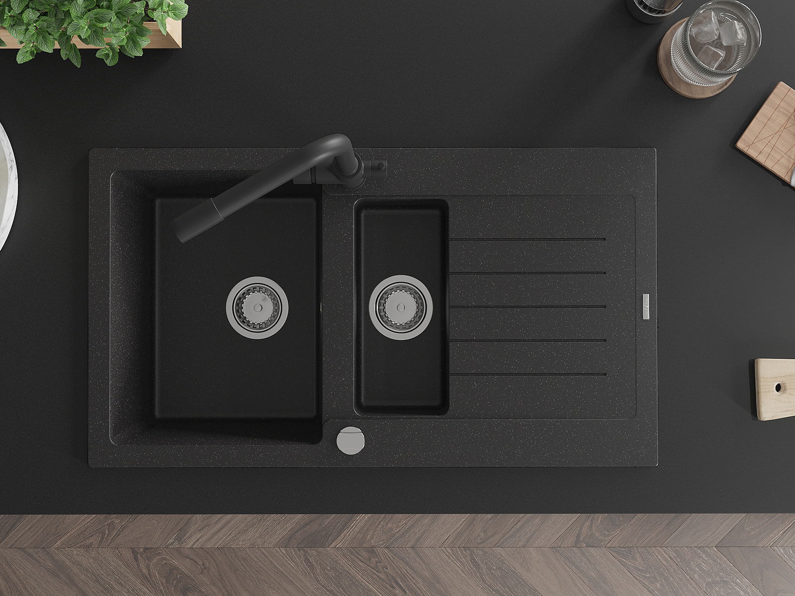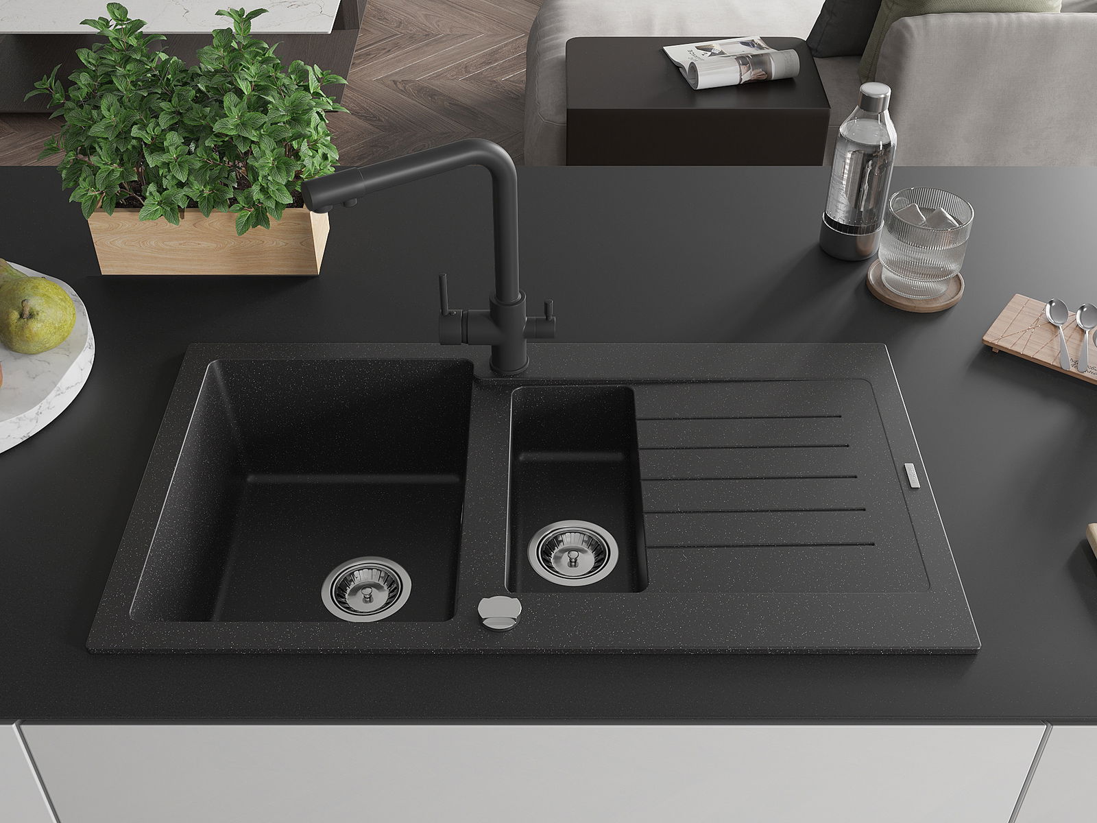 Mexen Matias νεροχύτης γρανίτης 1,5-θαλάμων με στραγγιστήρα και μπαταρία