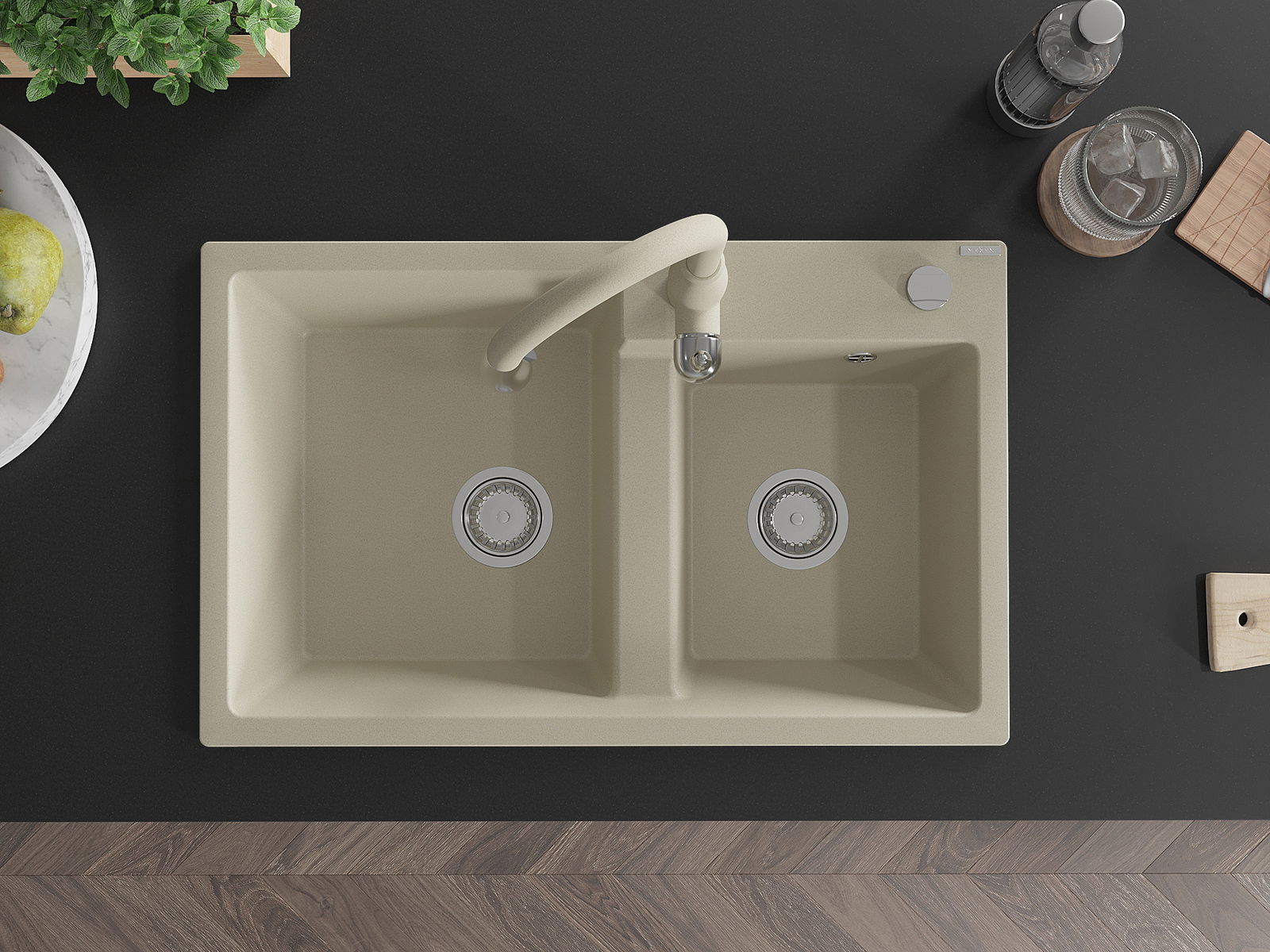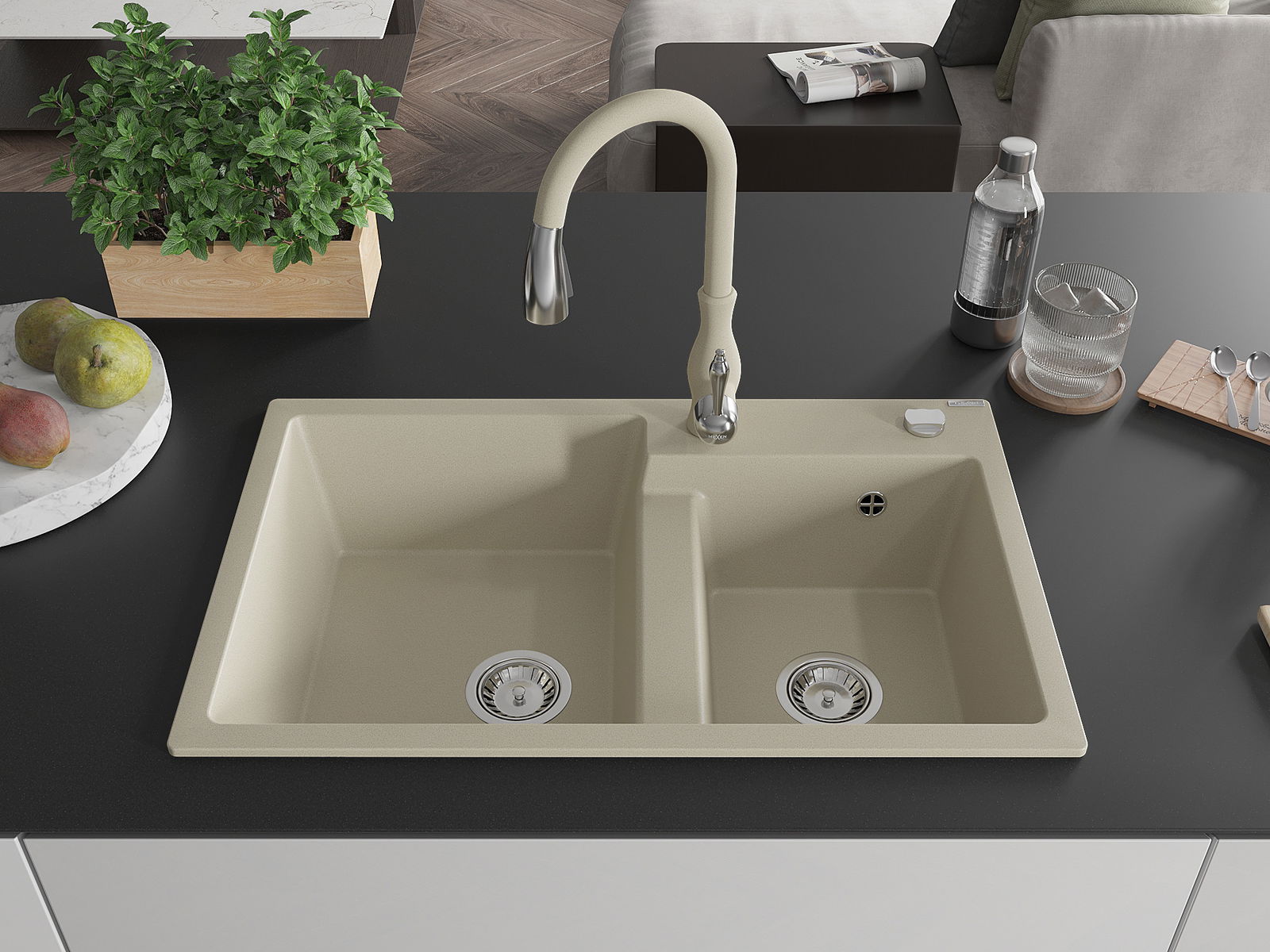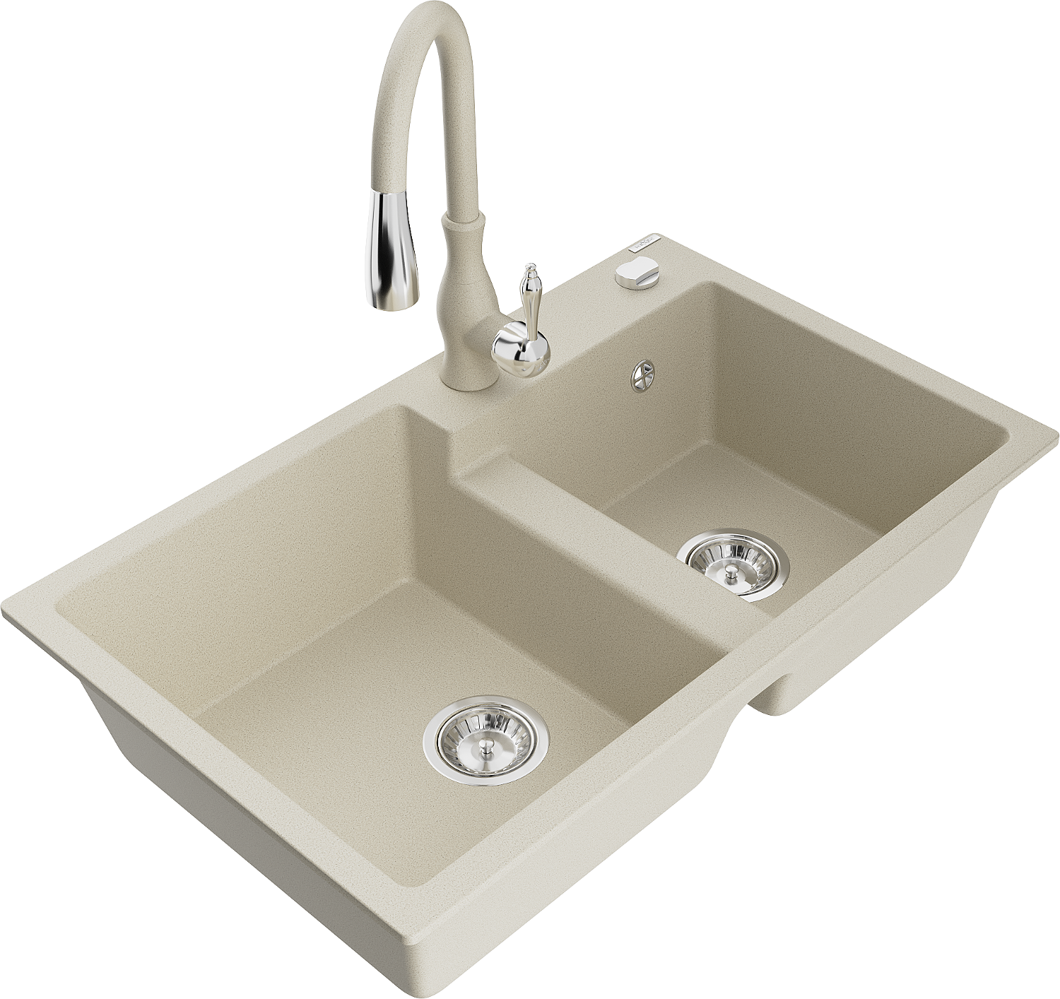 Mexen Tomas νεροχύτης γρανιτένιος 2-θαλάμων με μπαταρία κουζίνας Savita, μπεζ