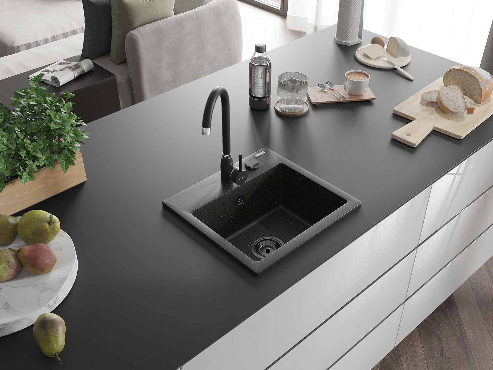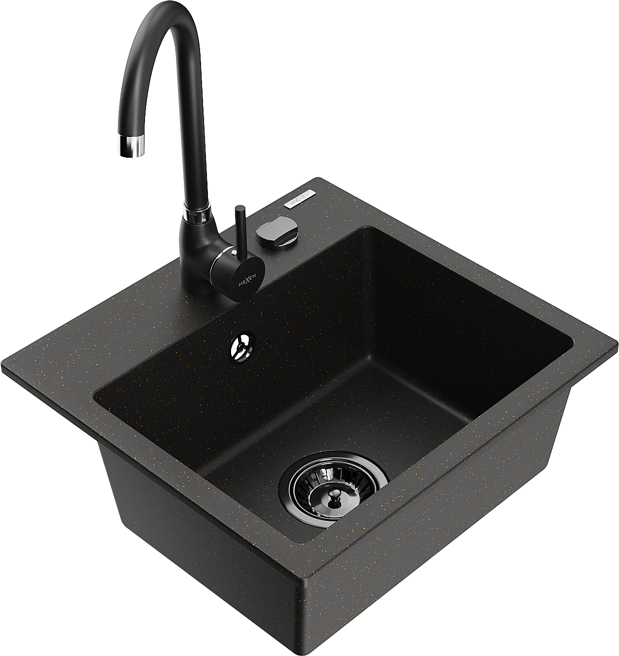 Mexen Milo νεροχύτης γρανίτης 1-κοιλώνας με βρύση κουζίνας Telma, μαύρο/χρυσό