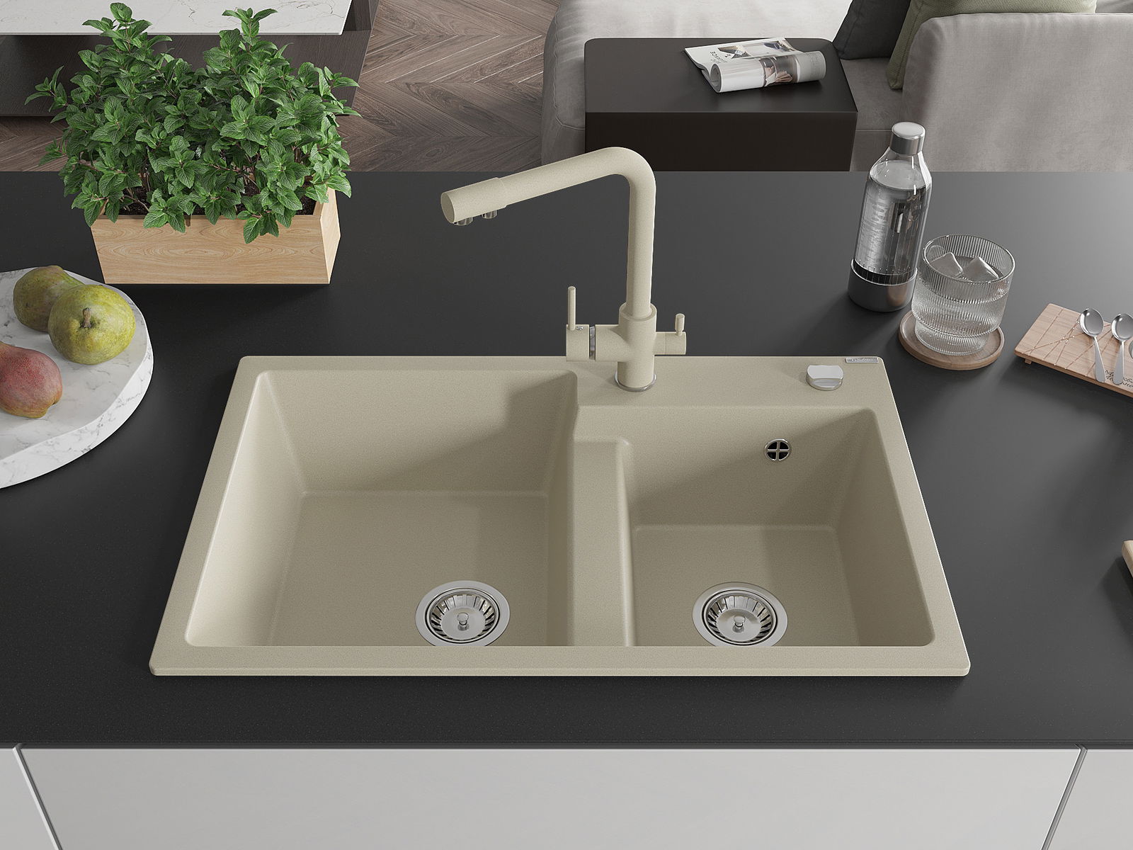 Mexen Tomas νεροχύτης γρανίτης 2-θαλάμων με μπαταρία κουζίνας Duero, μπεζ