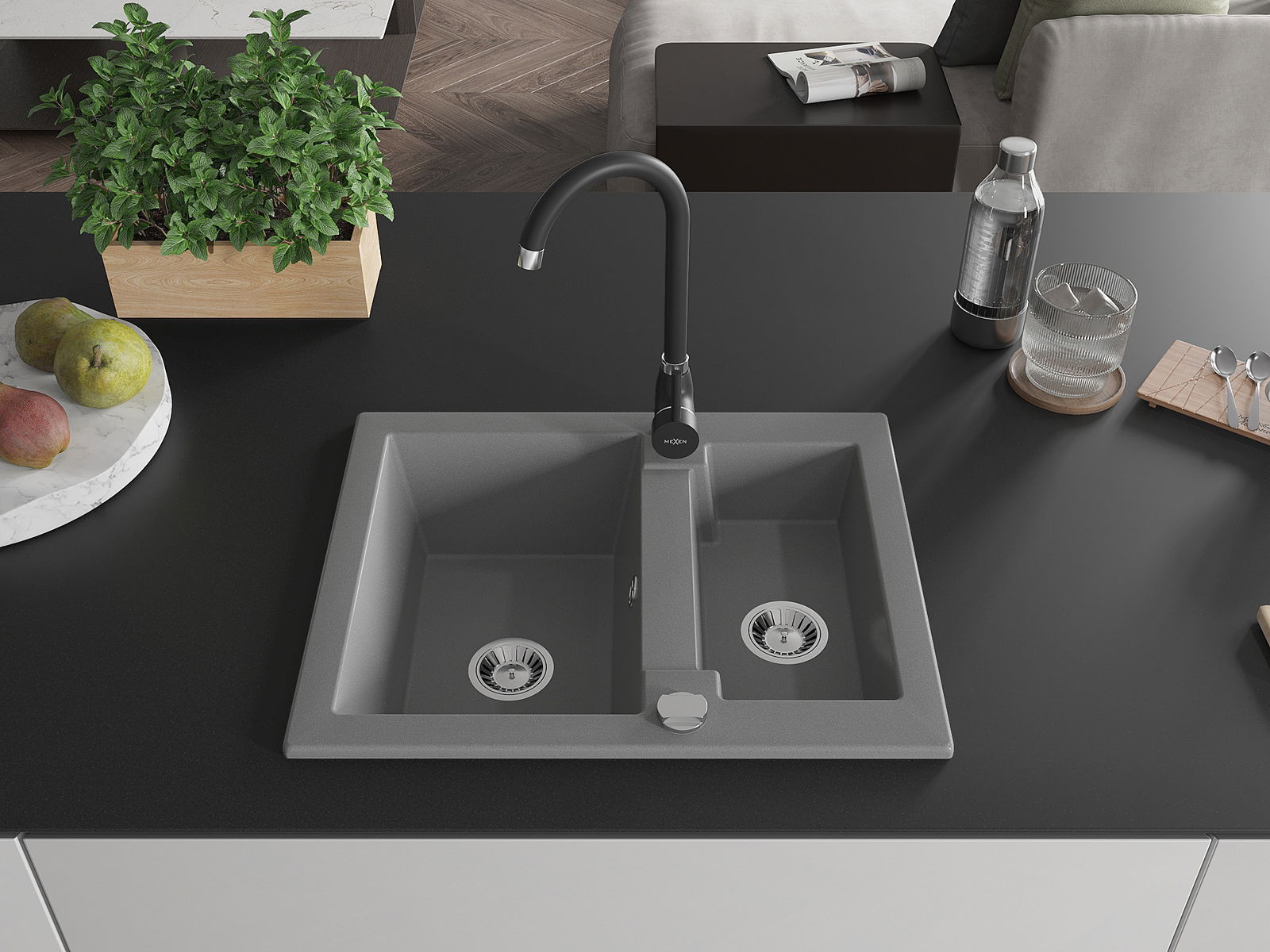 Mexen Carlos νεροχύτης γρανίτης 1,5 θαλάμων με μπαταρία κουζίνας Telma, γκρι
