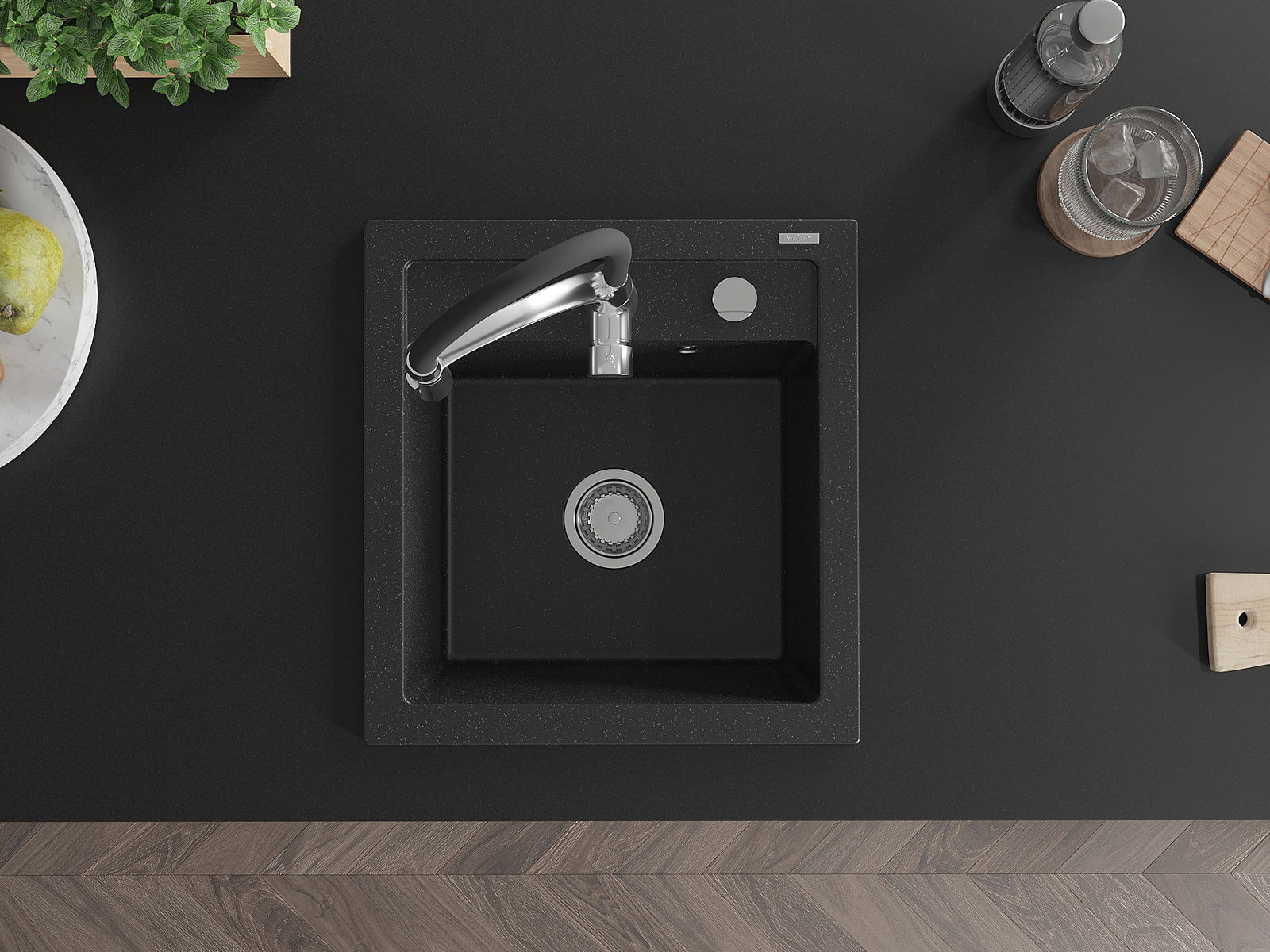 Mexen Vito Νεροχύτης γρανίτη 1 θάλαμο με μπαταρία κουζίνας Aster, μαύρο/ασημί