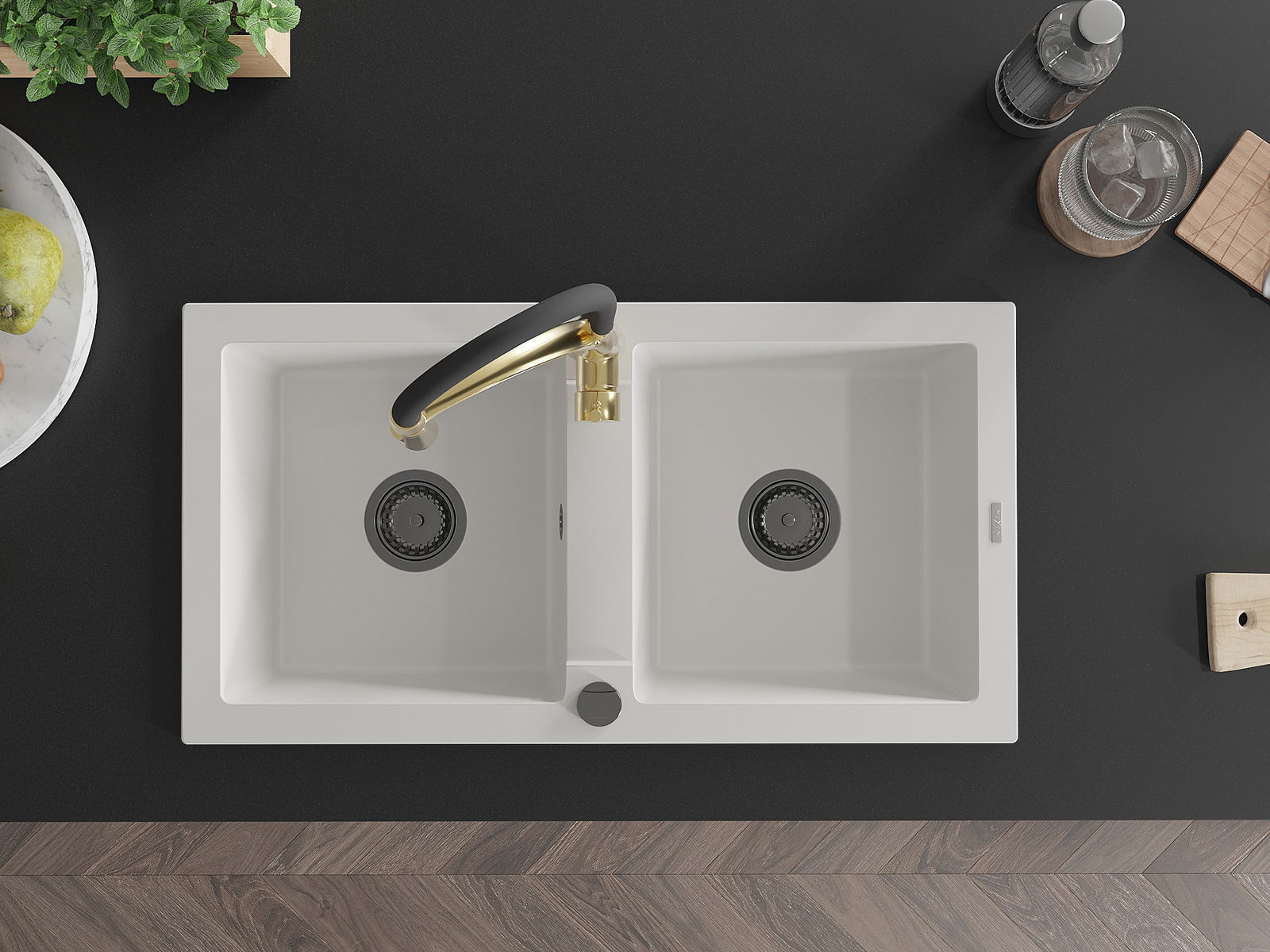 Mexen Mario νεροχύτης γρανίτη 2 θαλάμων με μπαταρία κουζίνας Aster, λευκό