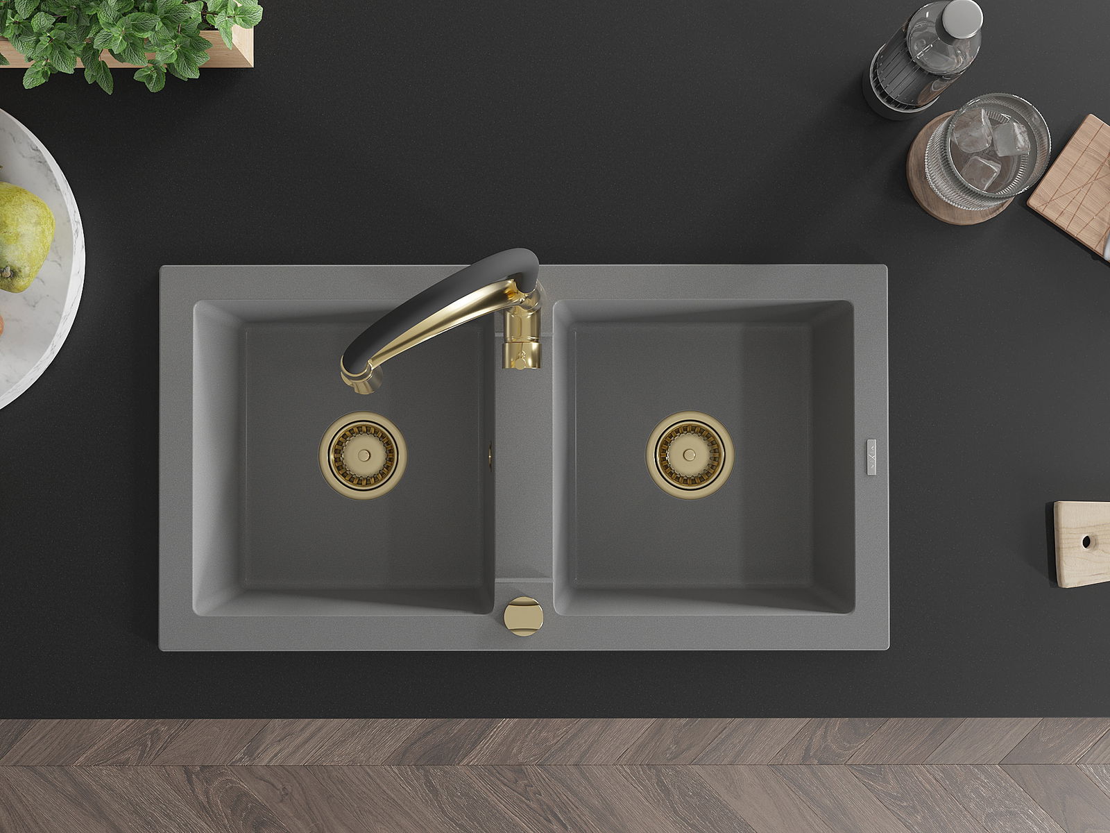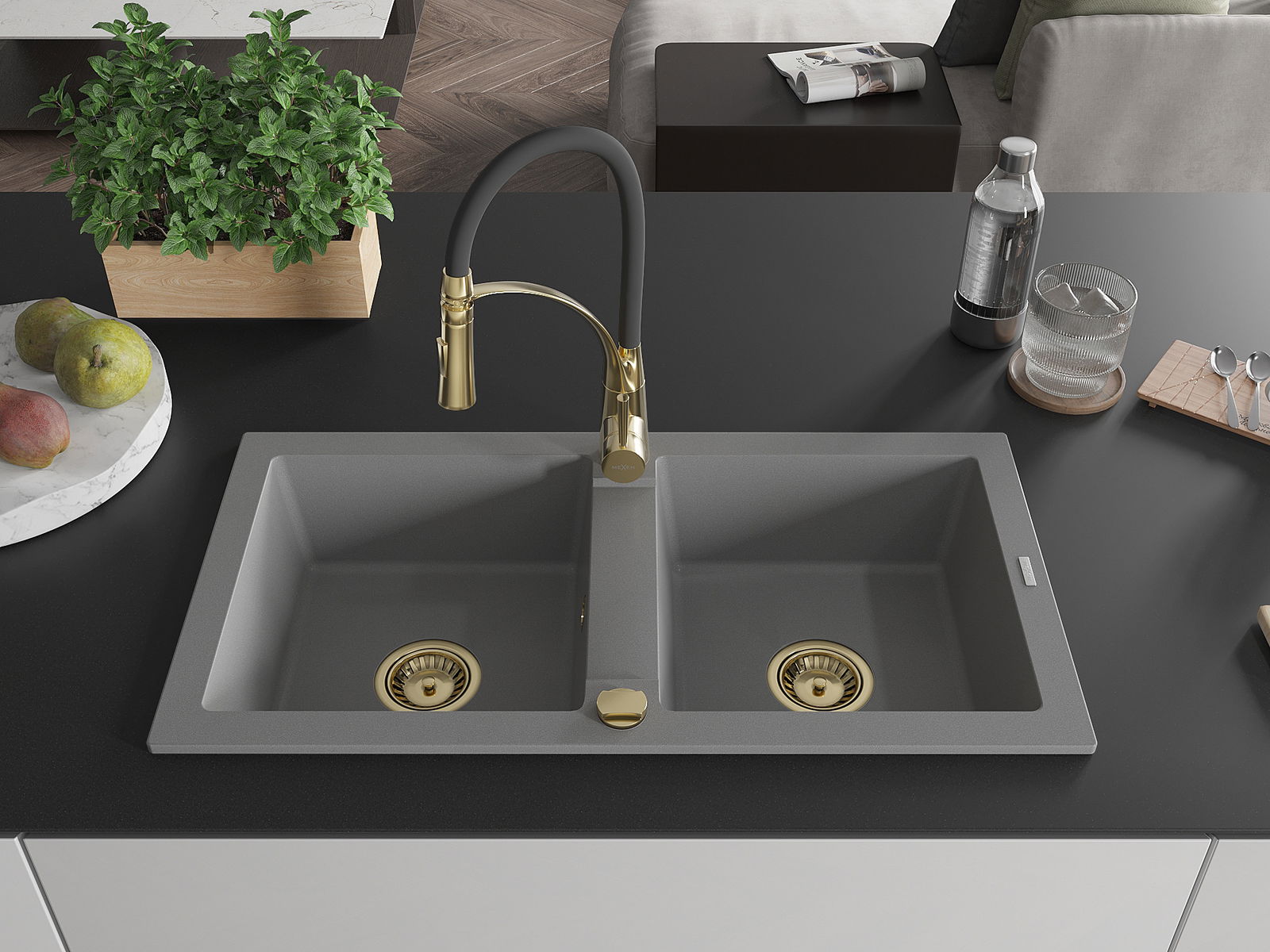 Mexen Mario νεροχύτης γρανίτη 2 θαλάμων με μπαταρία κουζίνας Aster, γκρι