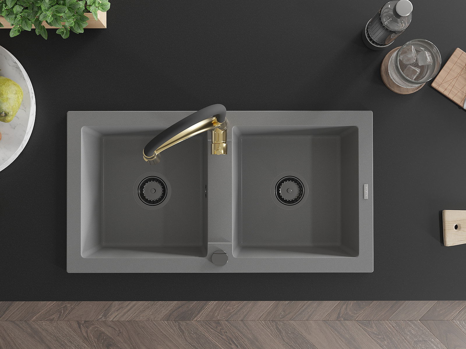 Mexen Mario Γρανιτένιος νεροχύτης 2 θαλάμων με μπαταρία κουζίνας Aster, γκρι