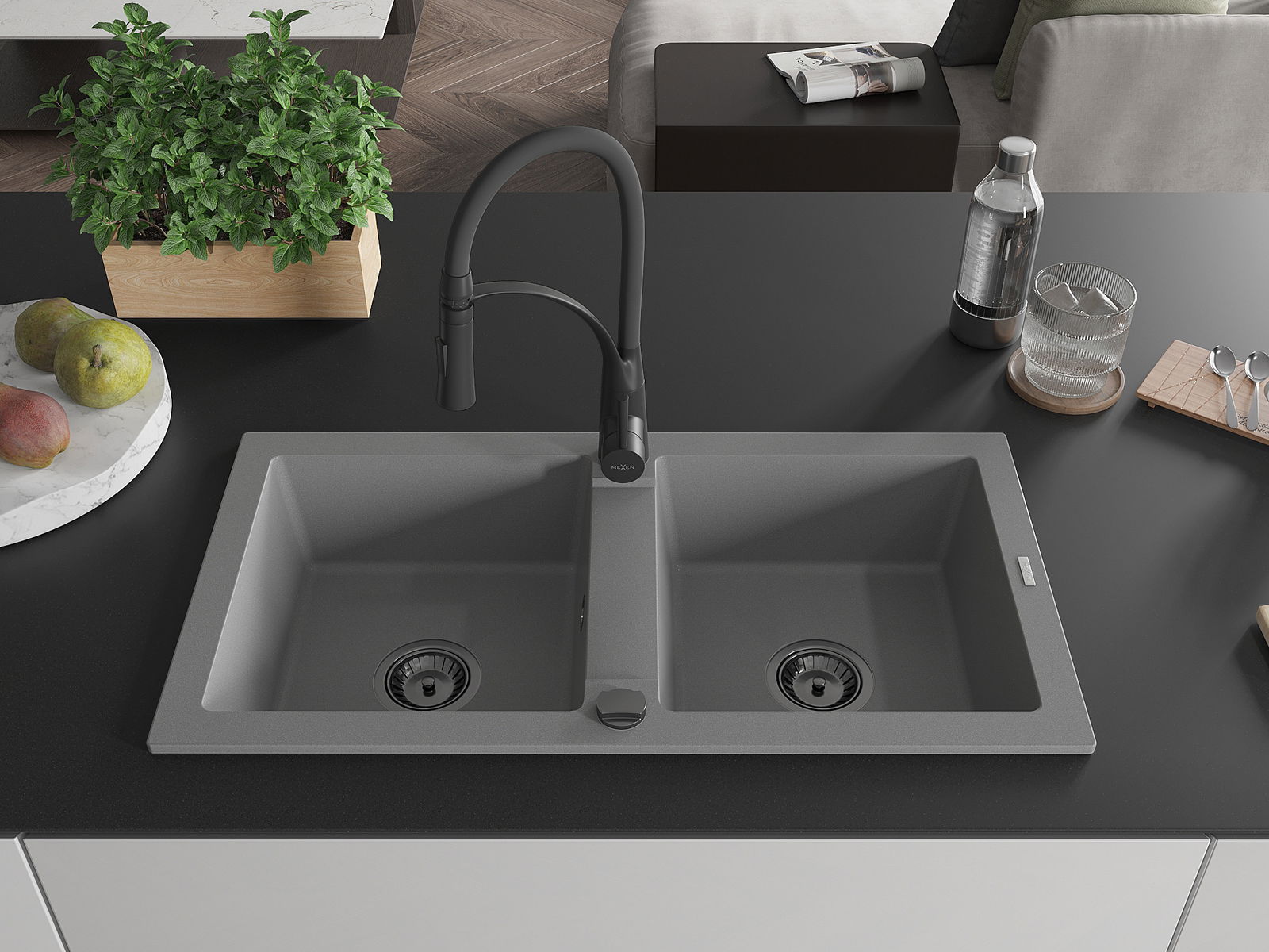Mexen Mario νεροχύτης γρανίτης με 2 θαλάμους και κουζίνα βρύσης Aster, γκρι