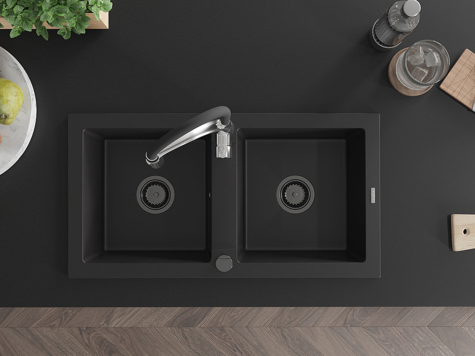 Mexen Mario νεροχύτης γρανίτης 2 θαλάμων με μπαταρία κουζίνας Aster, μαύρος