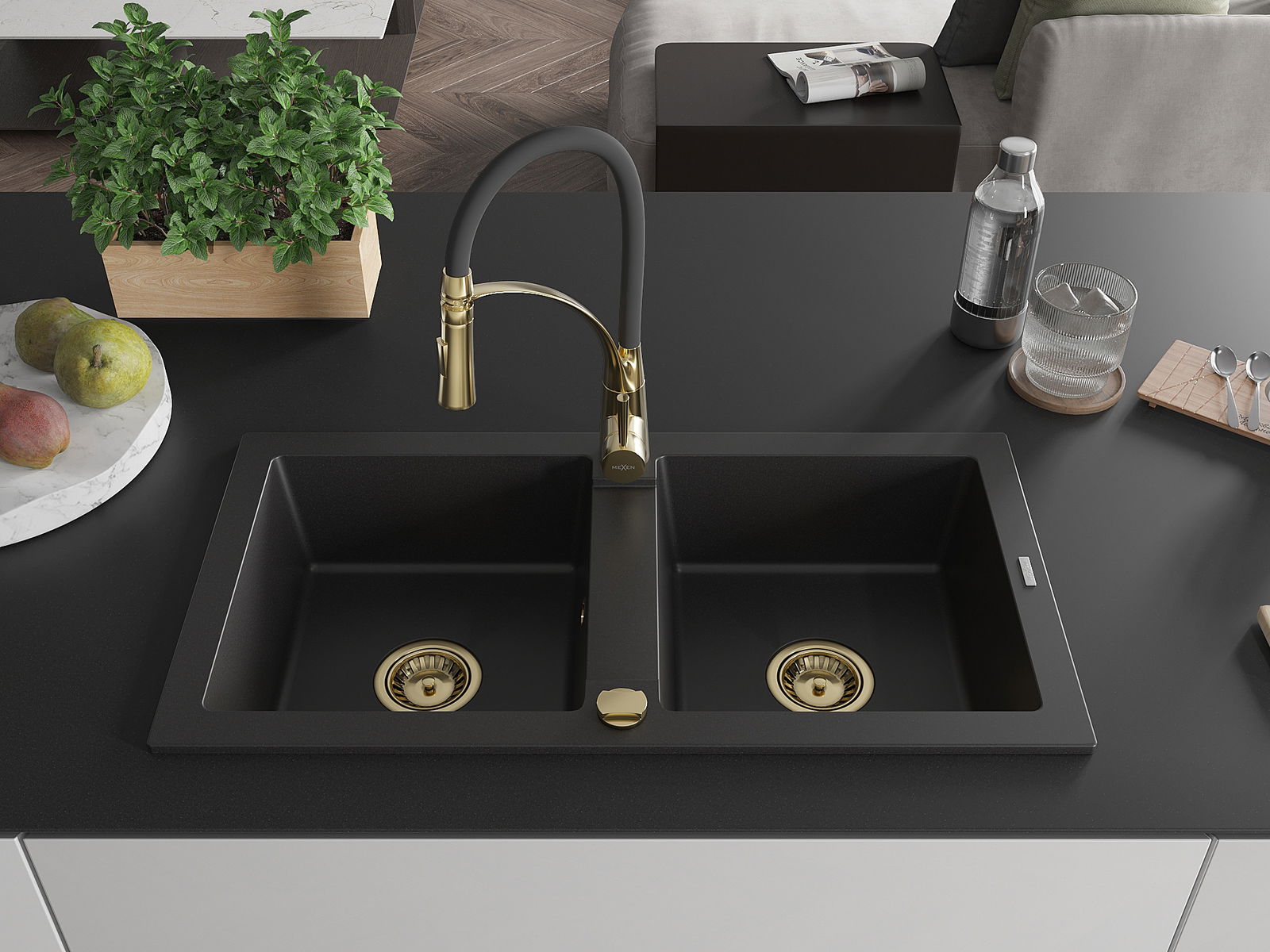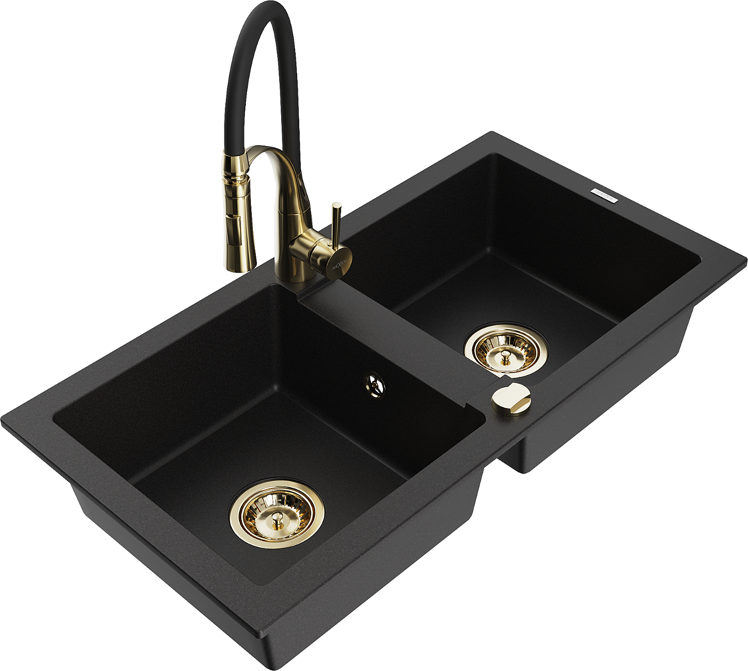 Mexen Mario νεροχύτης γρανίτης 2-θαλάμων με μπαταρία κουζίνας Aster, μαύρος