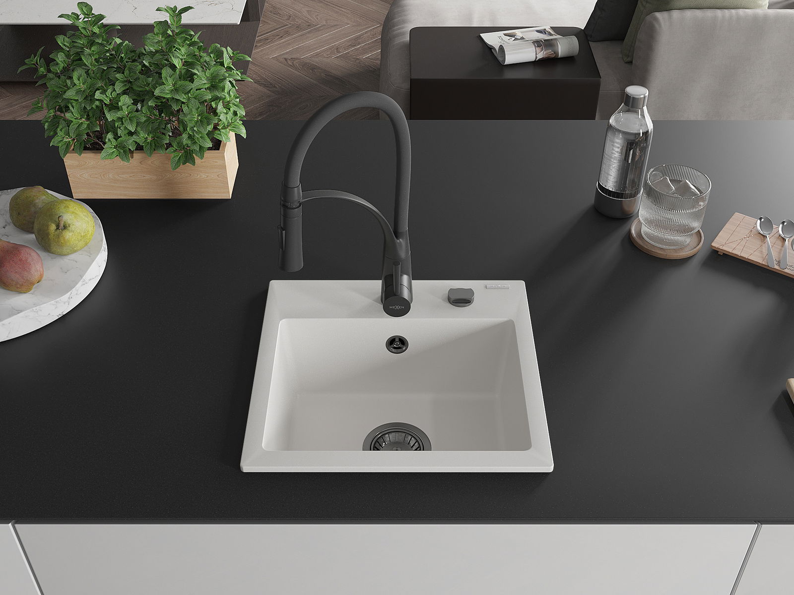 Mexen Milo νεροχύτης γρανίτη 1-δοχείο με μπαταρία κουζίνας Aster, λευκός