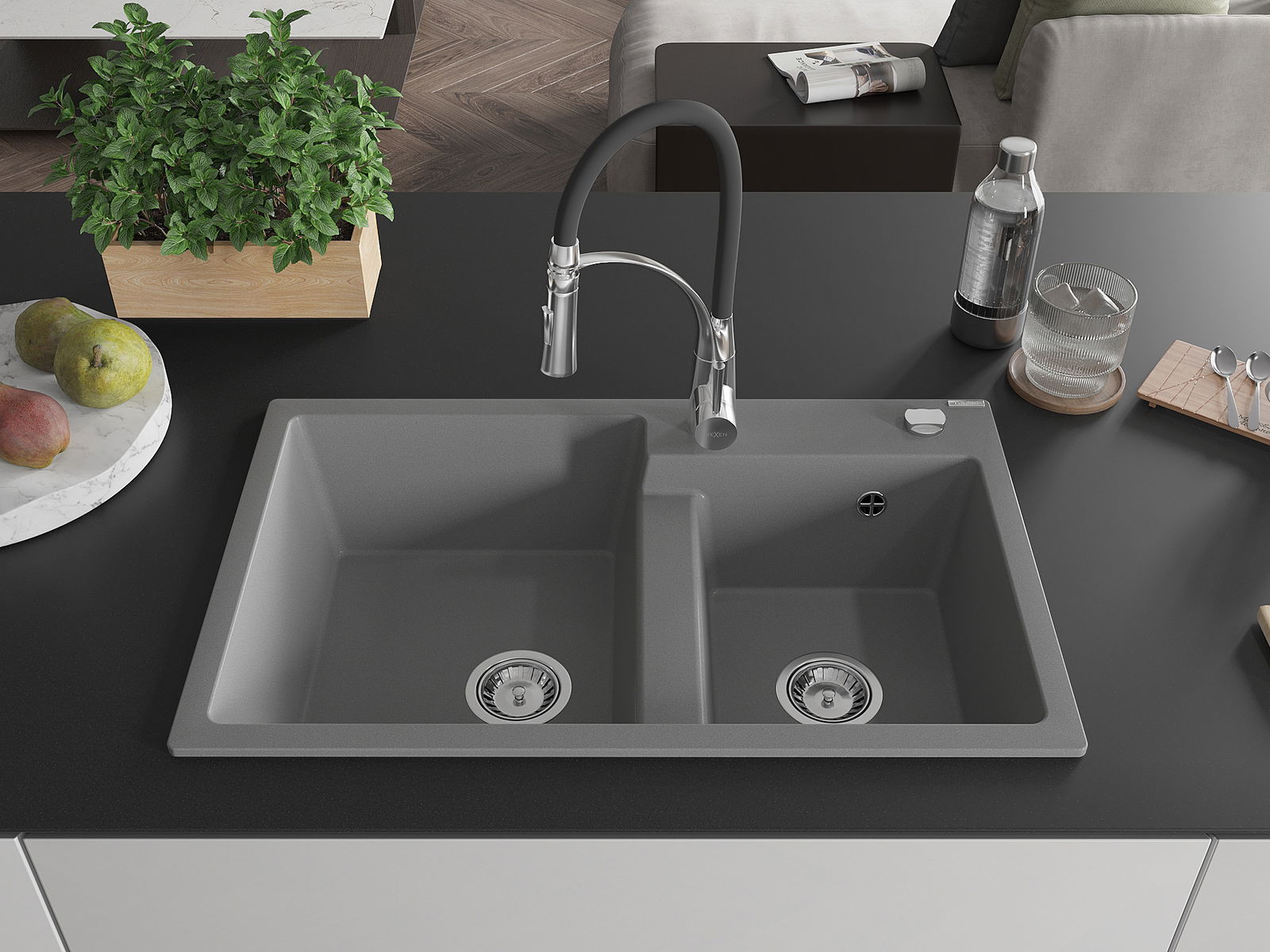 Mexen Tomas νεροχύτης γρανιτένιος 2-διαμερισμάτων με μπαταρία κουζίνας Aster,