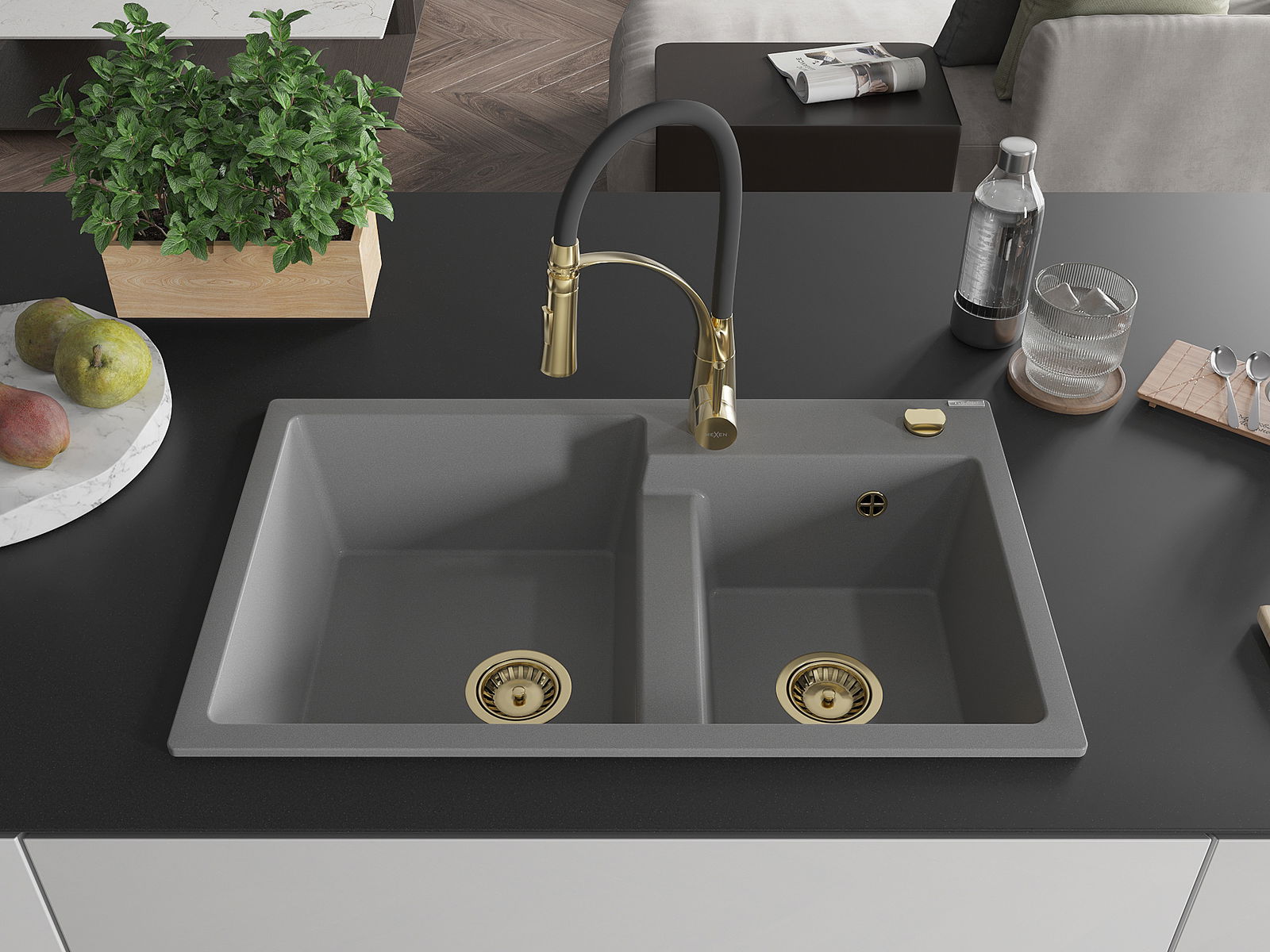 Mexen Tomas νεροχύτης από γρανίτη 2 θαλάμων με μπαταρία κουζίνας Aster, γκρι