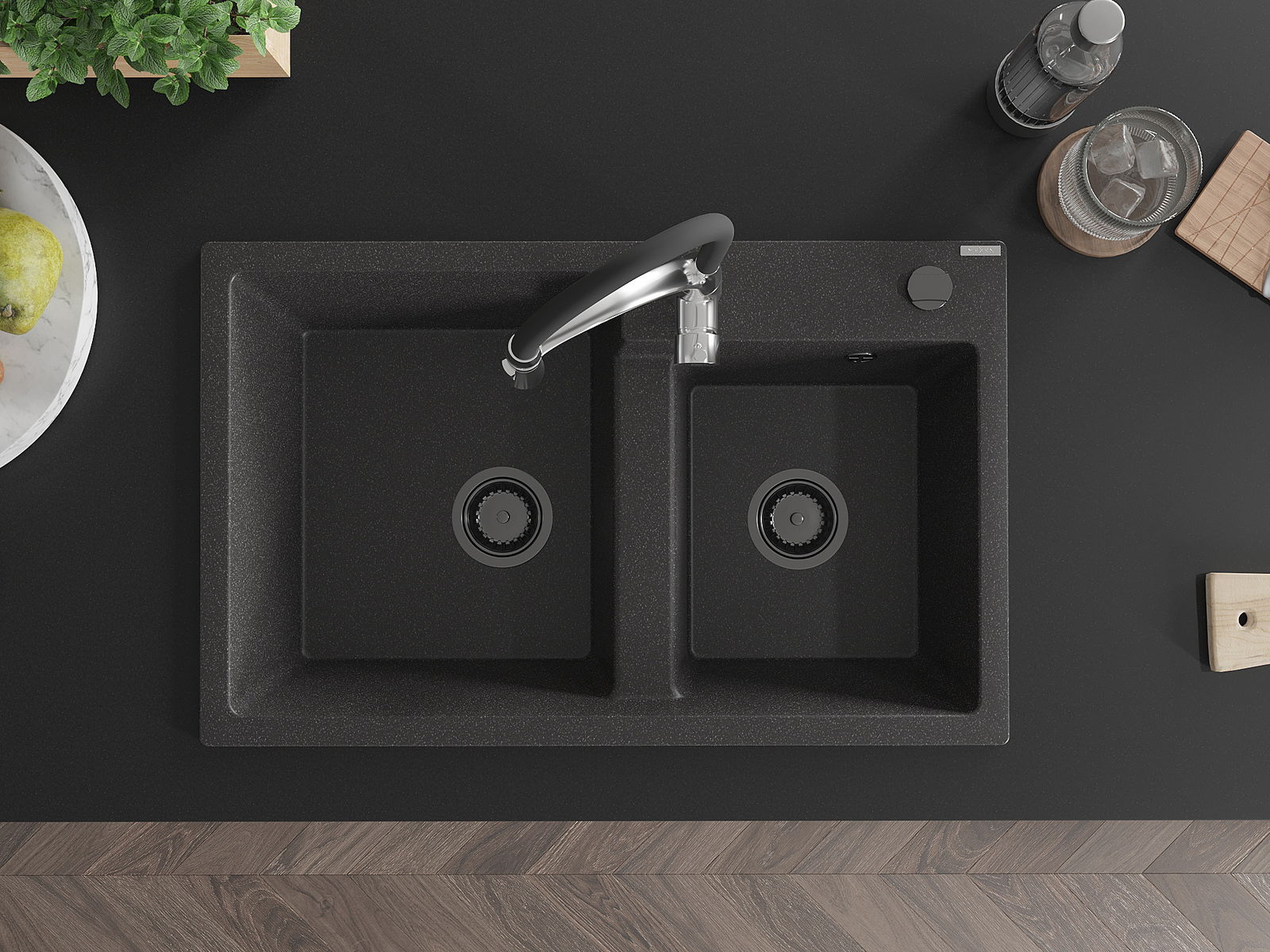 Mexen Tomas νεροχύτης γρανίτης δύο θαλάμων με μπαταρία κουζίνας Aster, μαύρη