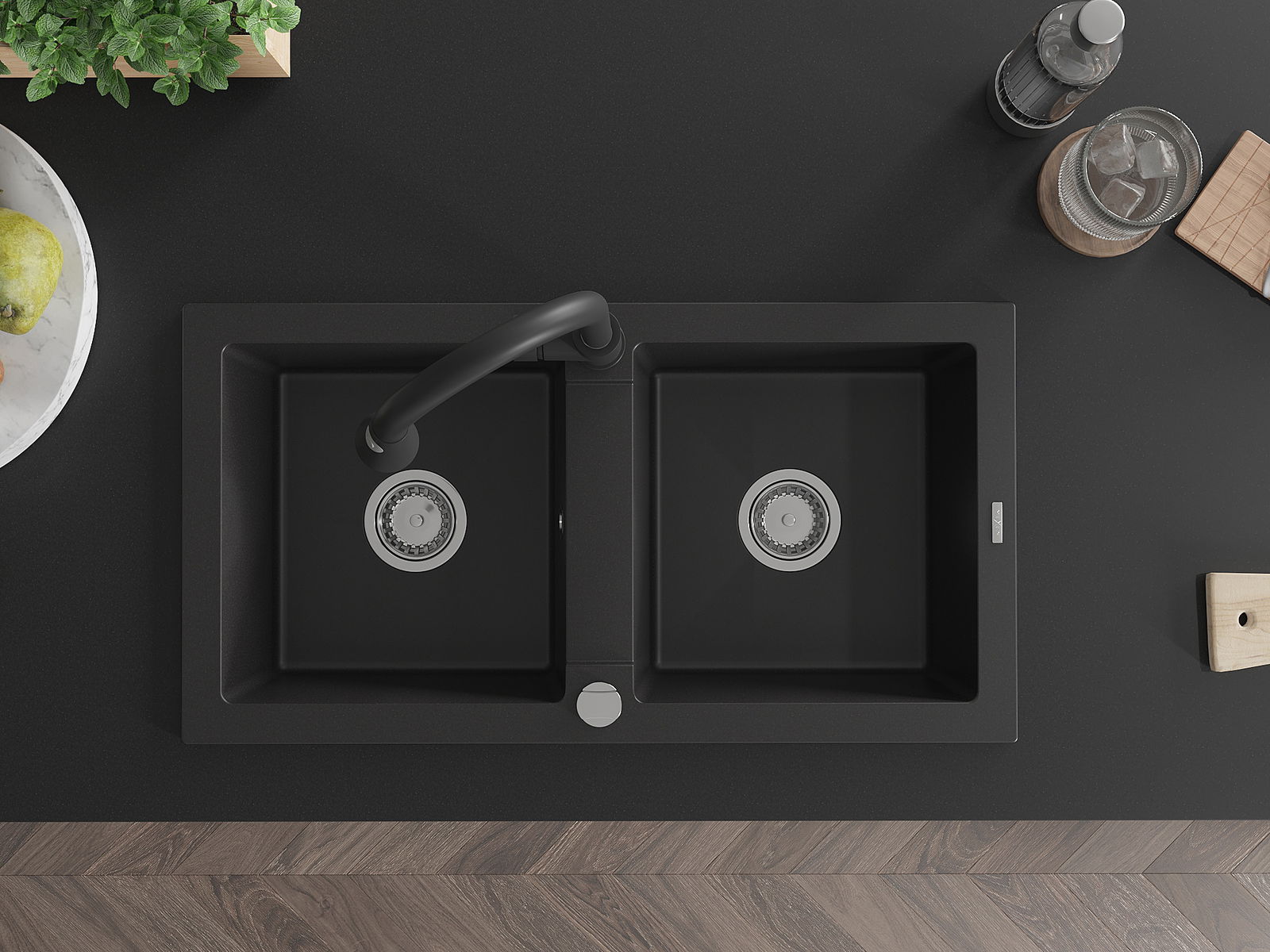 Mexen Mario νεροχύτης γρανίτης 2-θέσεων με μπαταρία κουζίνας Elia, μαύρος