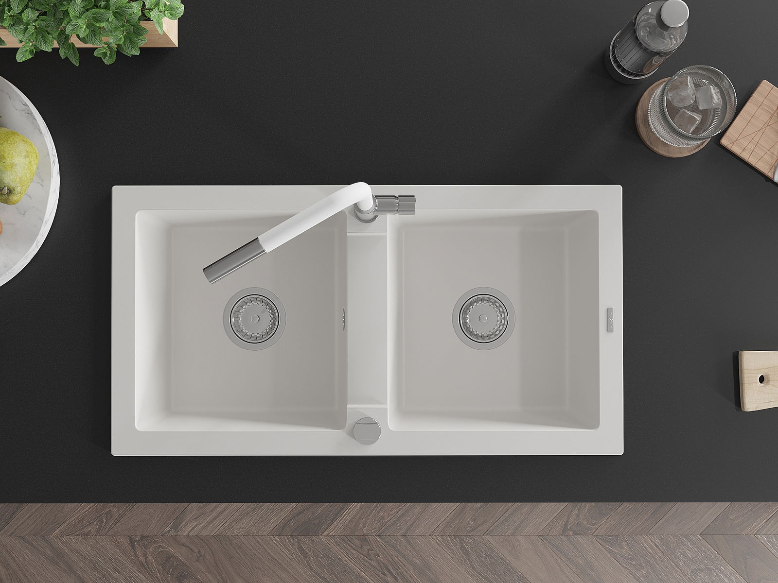 Mexen Mario νεροχύτης γρανίτης 2-θάλαμος με μπαταρία κουζίνας Flora, λευκός