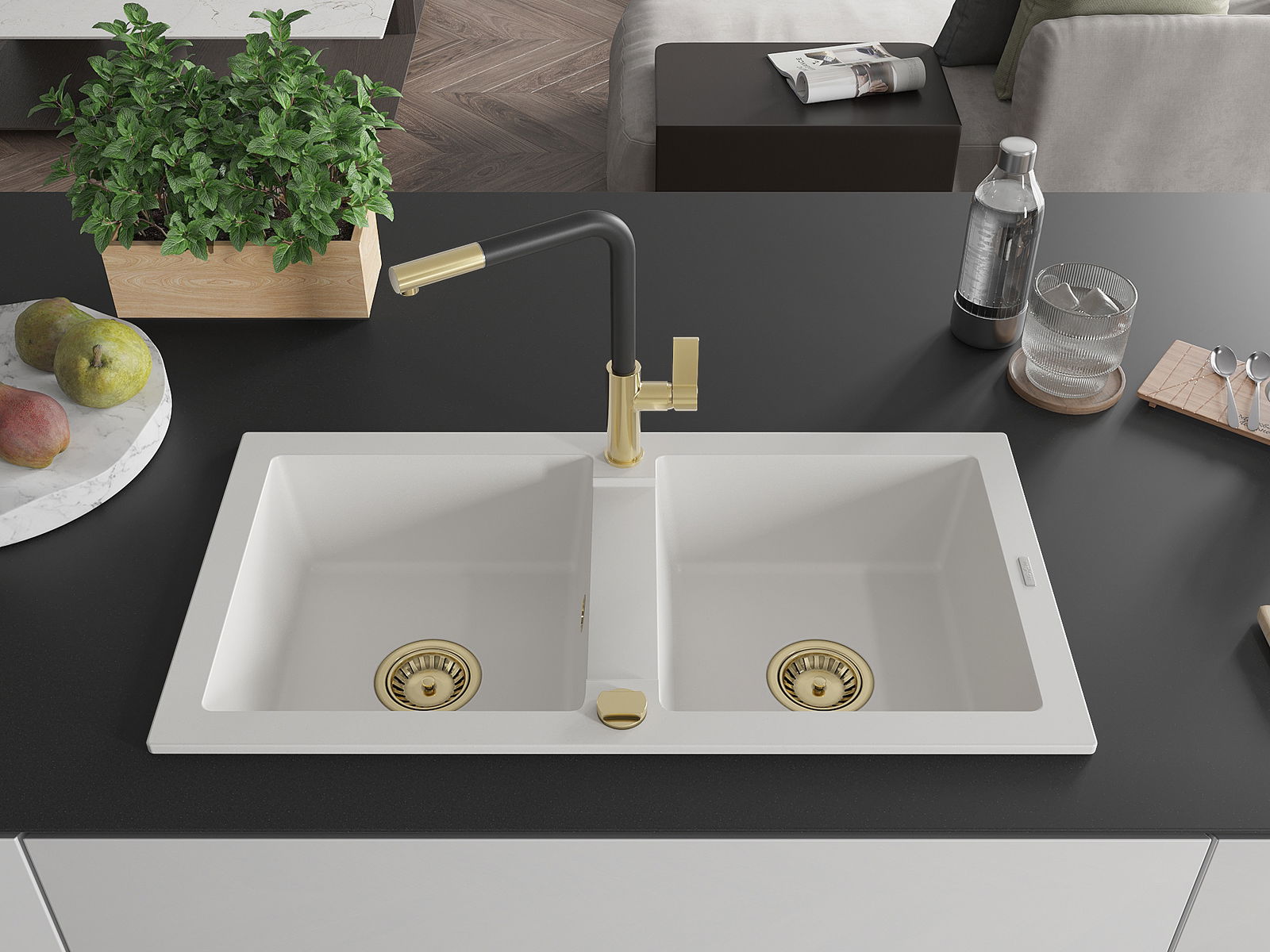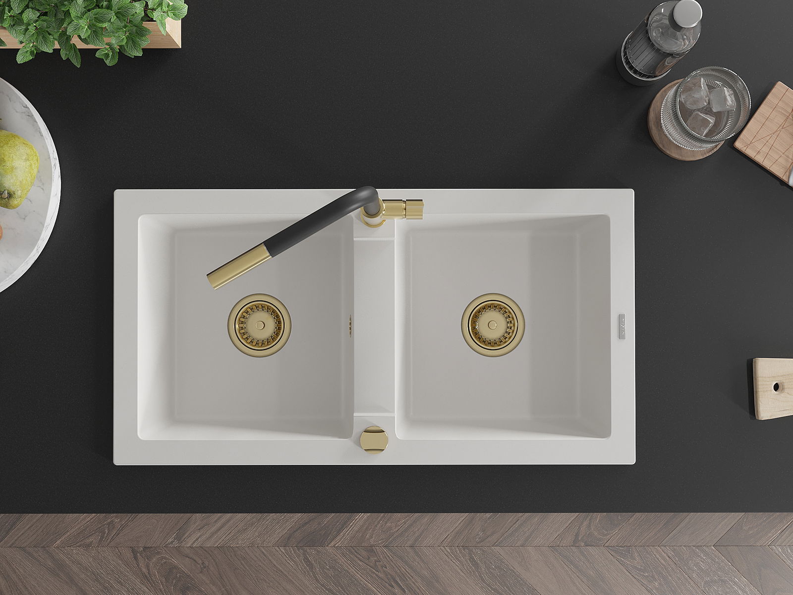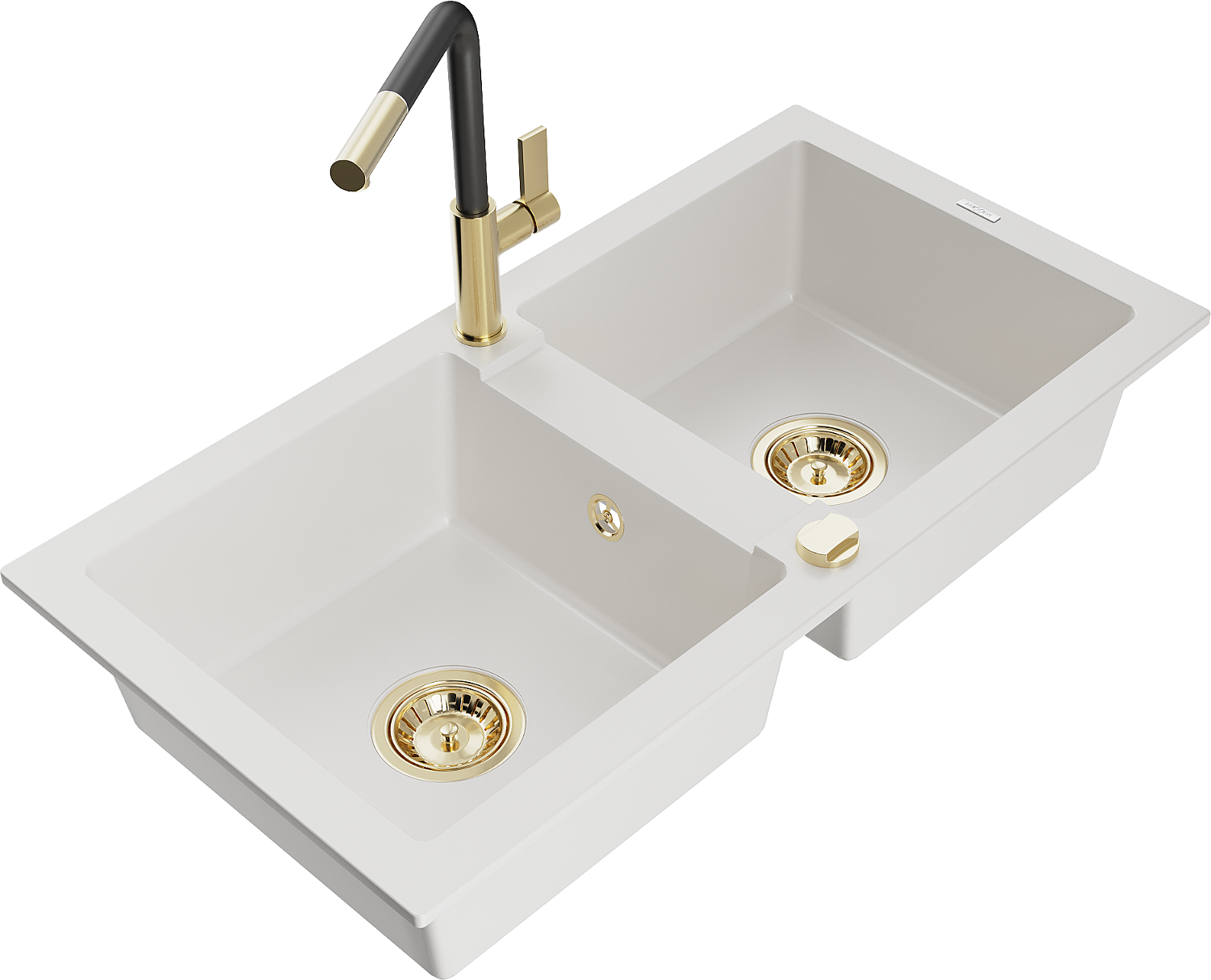 Mexen Mario νεροχύτης γρανιτένιος δύο θαλαμών με μπαταρία κουζίνας Flora,