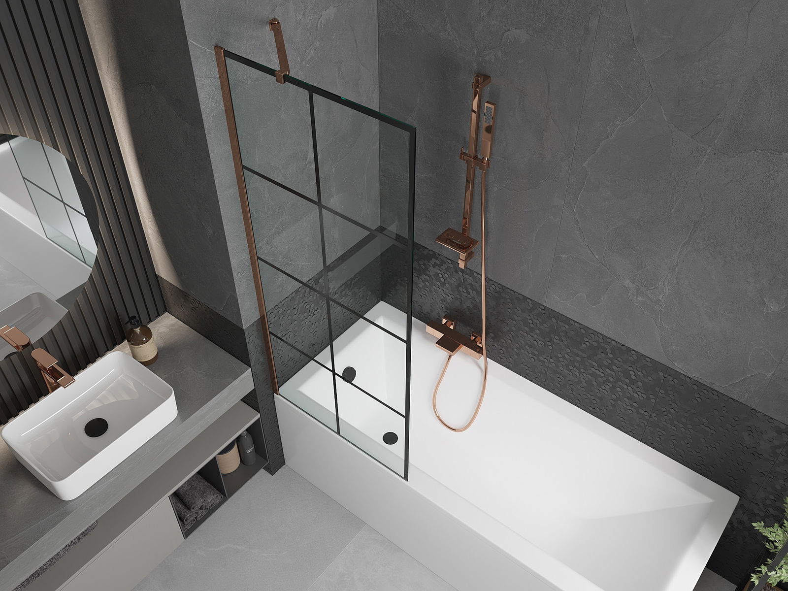 Mexen Next δίφυλλη καμπίνα μπάνιου 70 x 150 cm, μαύρο πλέγμα, ροζ χρυσό