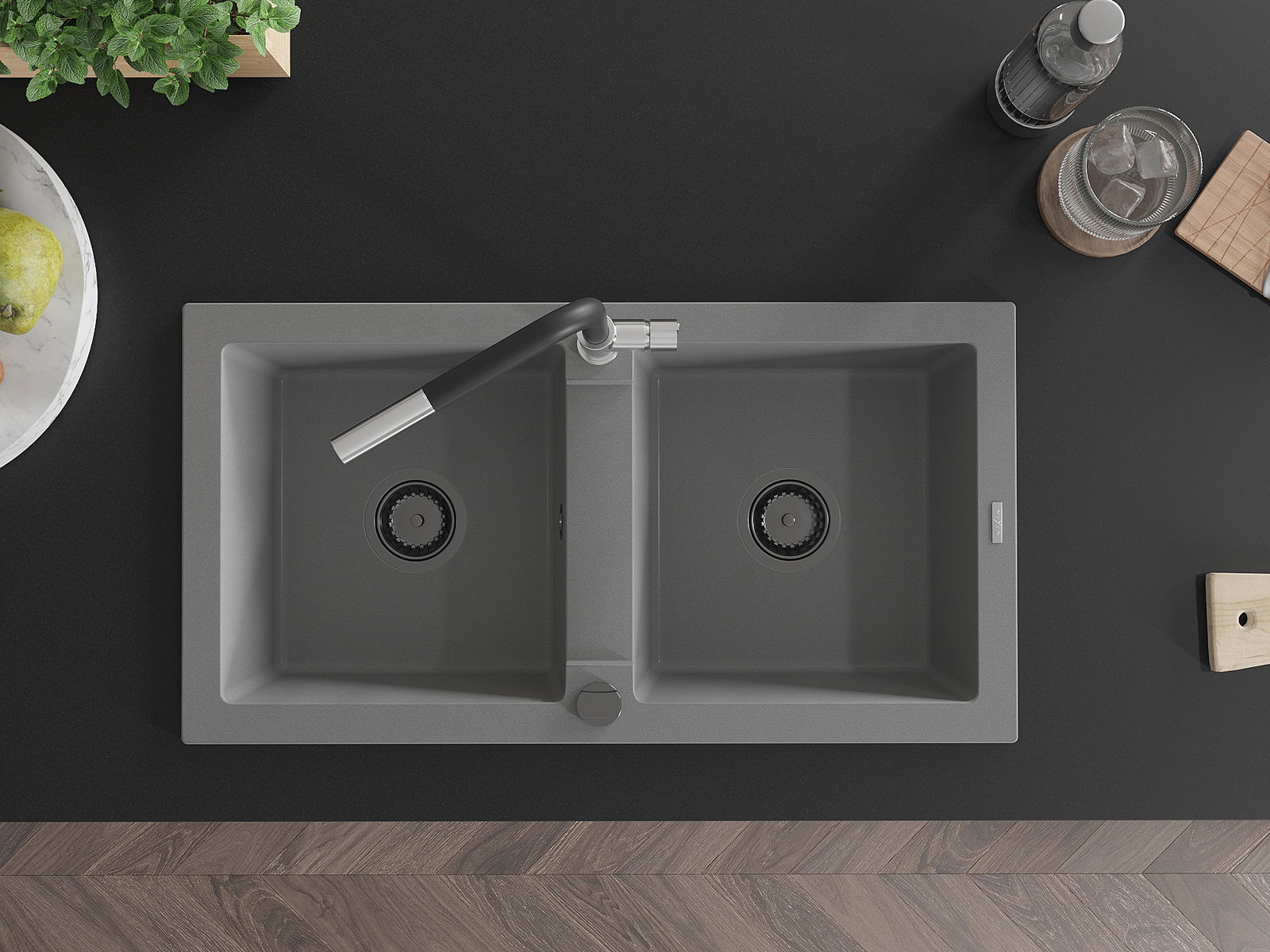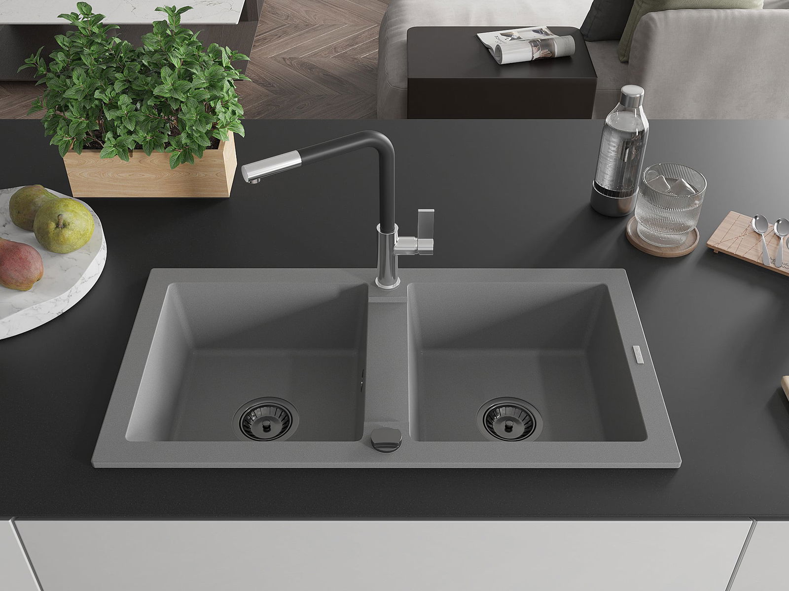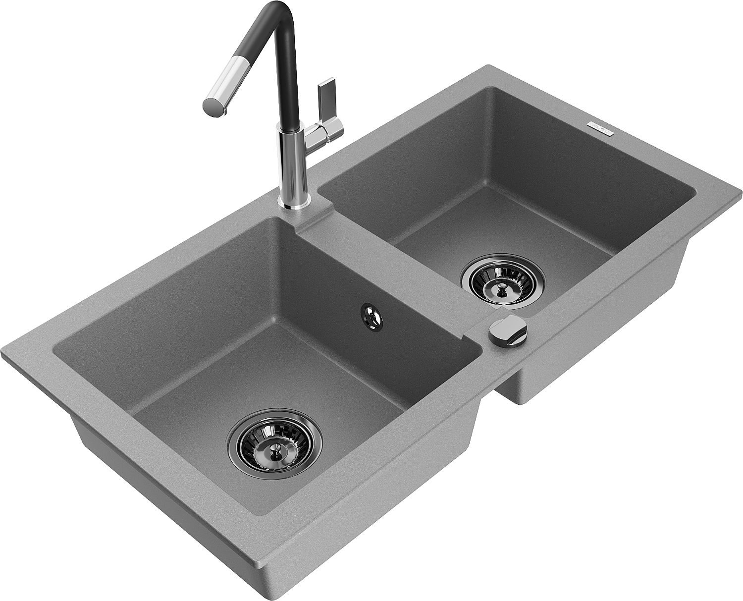 Mexen Mario γκρανίτης νιπτήρας κουζίνας 2-θέσεων με μπαταρία Flora, γκρι