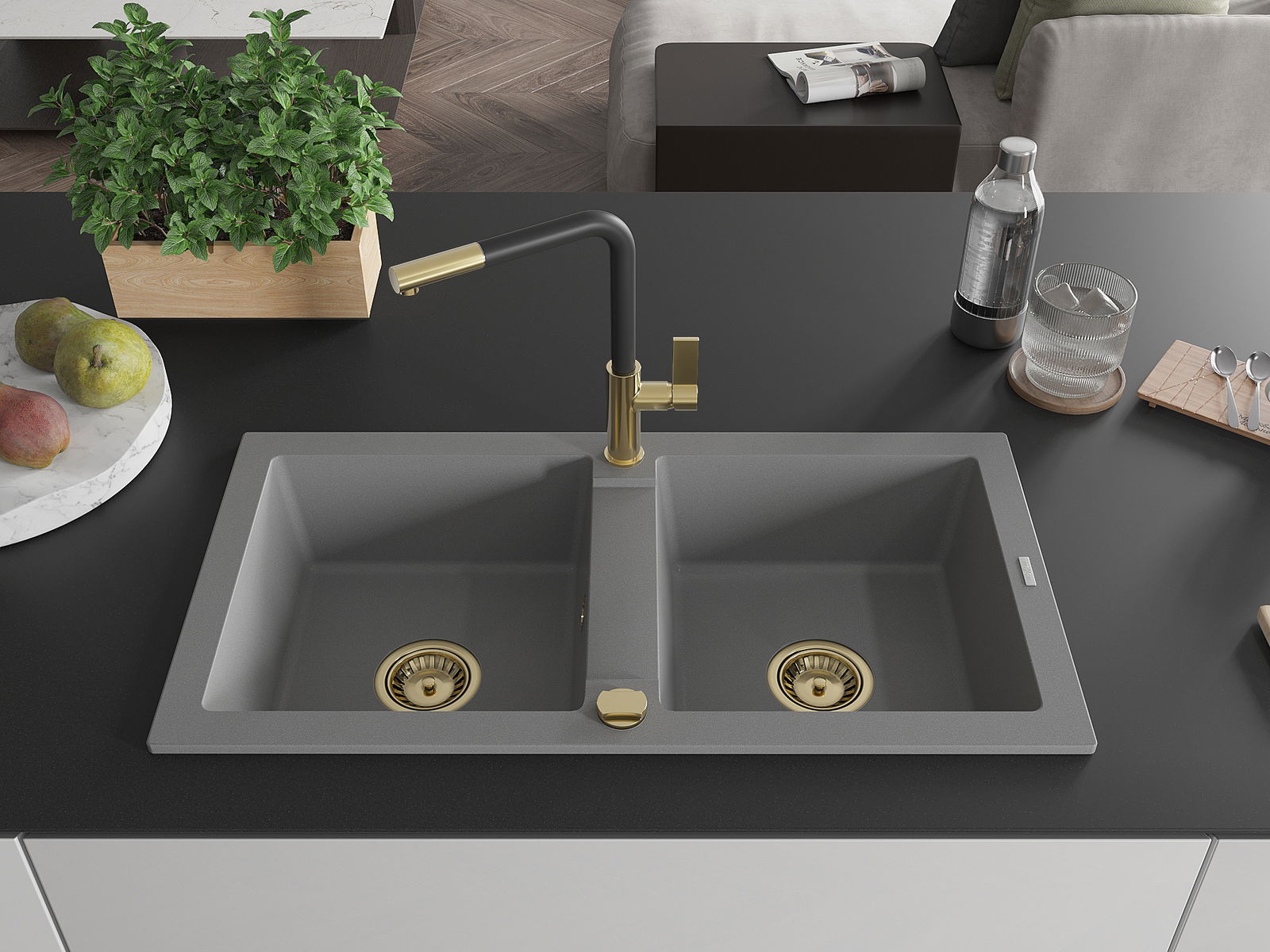 Mexen Mario νεροχύτης γρανίτη 2-διαμερισμάτων με μπαταρία κουζίνας Flora,