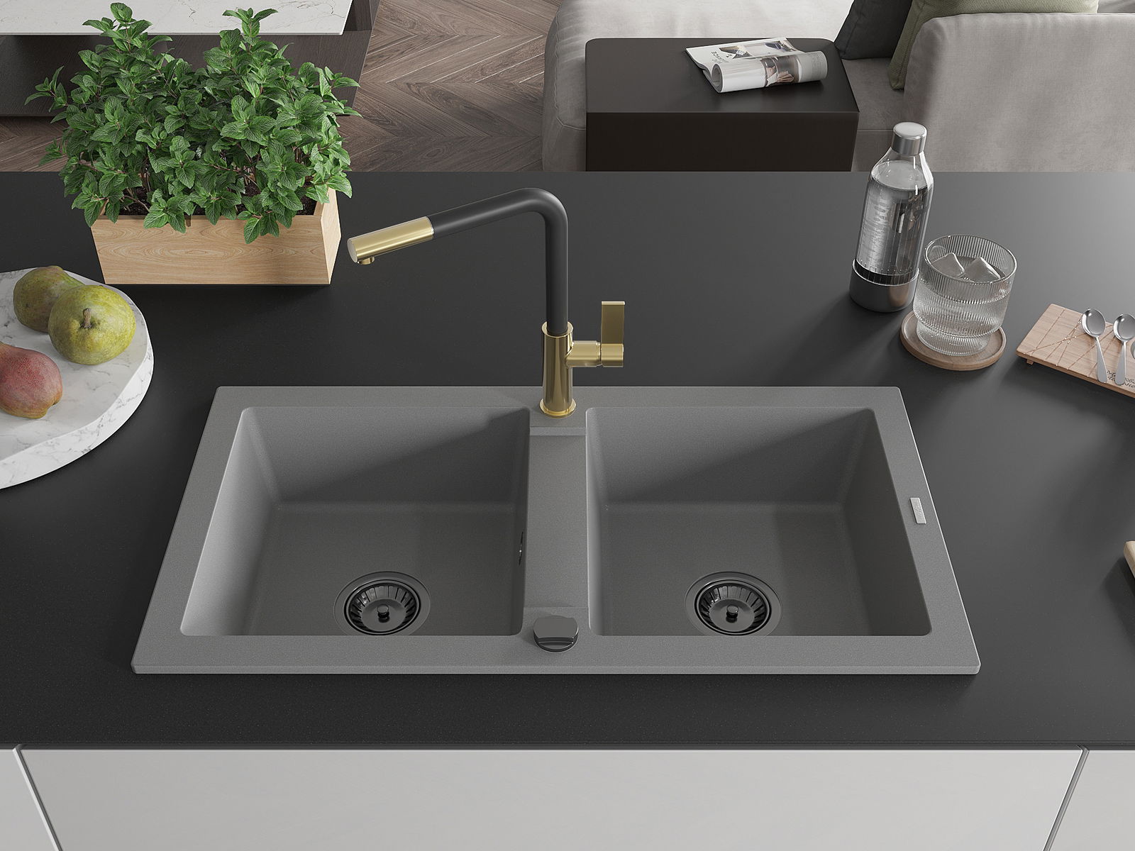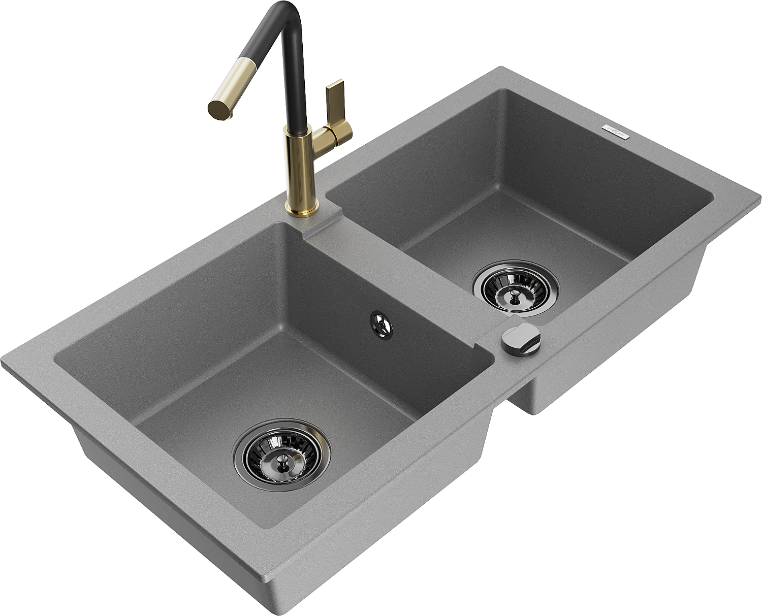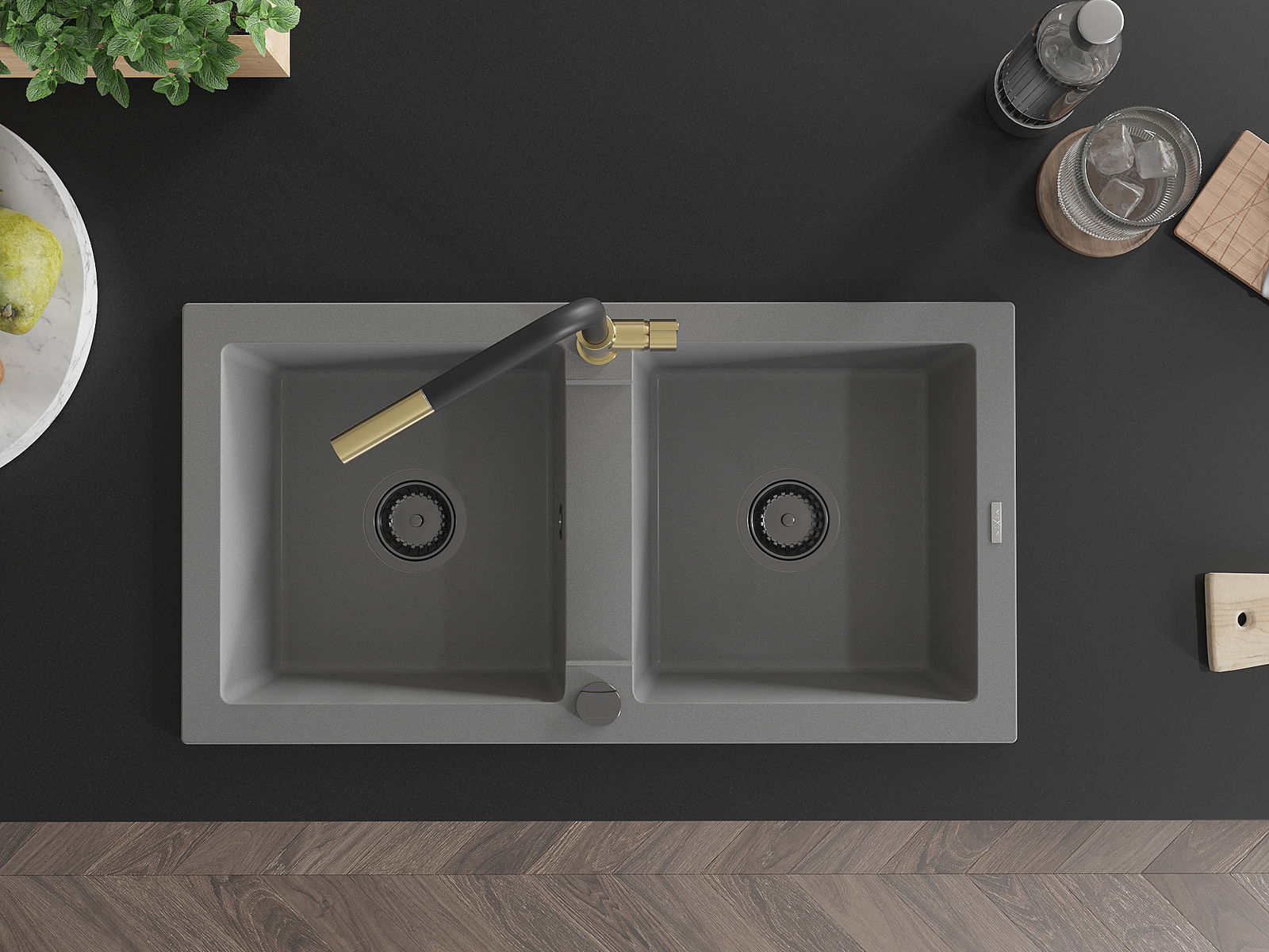 Mexen Mario νεροχύτης γρανίτης 2 θαλάμων με μπαταρία κουζίνας Flora, γκρι