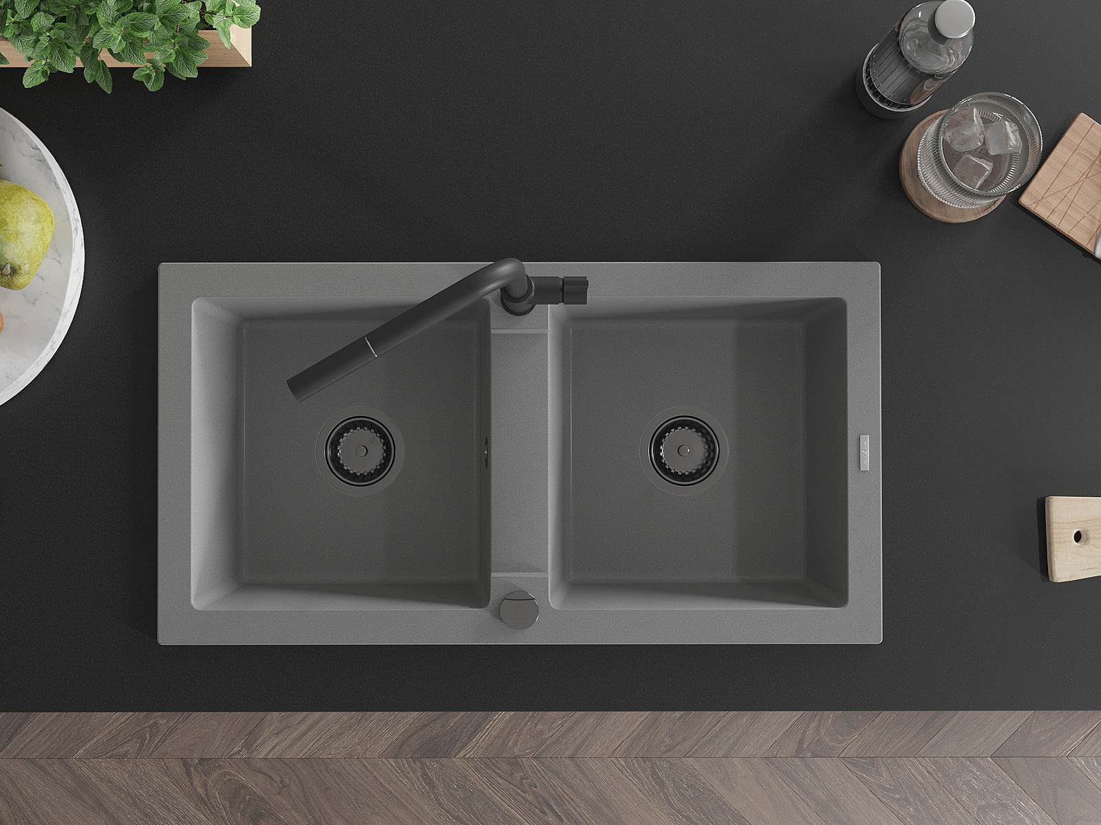 Mexen Mario νεροχύτης γρανίτης 2-θαλάμων με μπαταρία κουζίνας Flora, γκρι