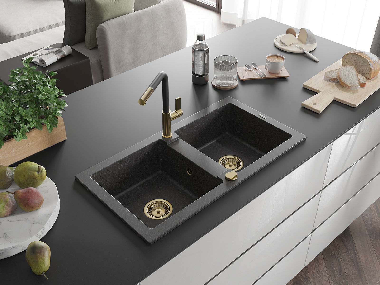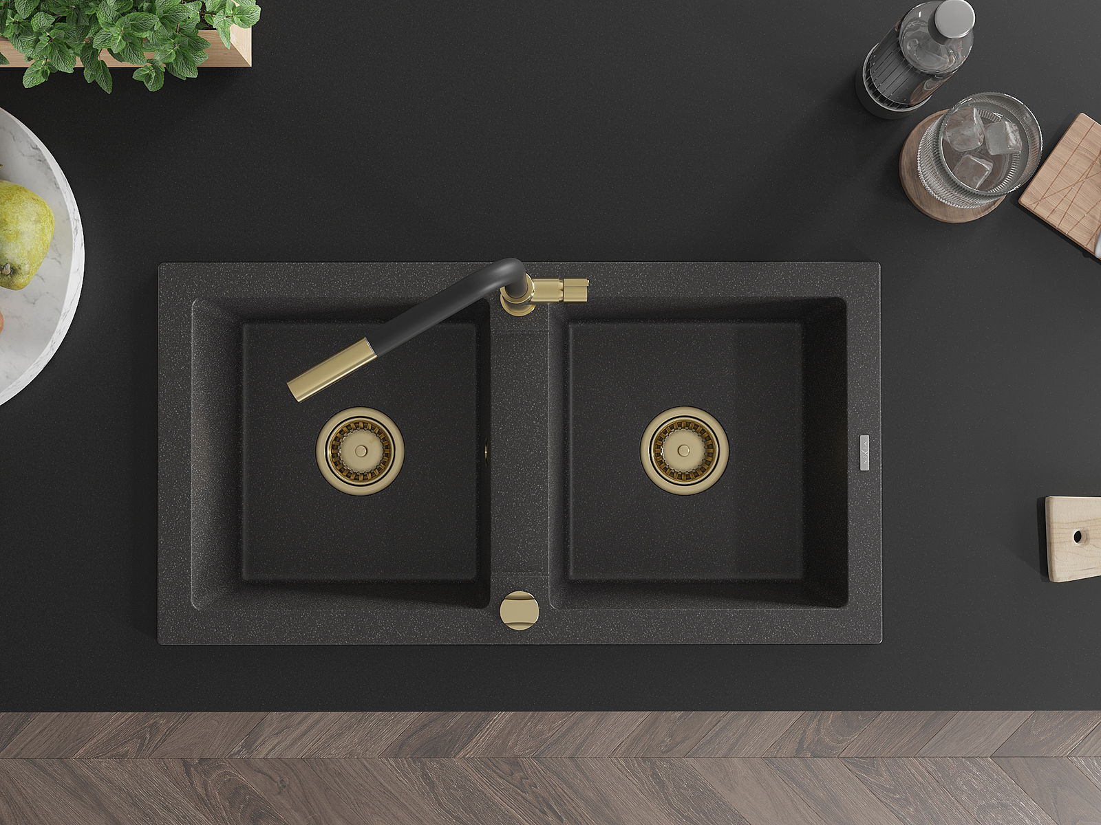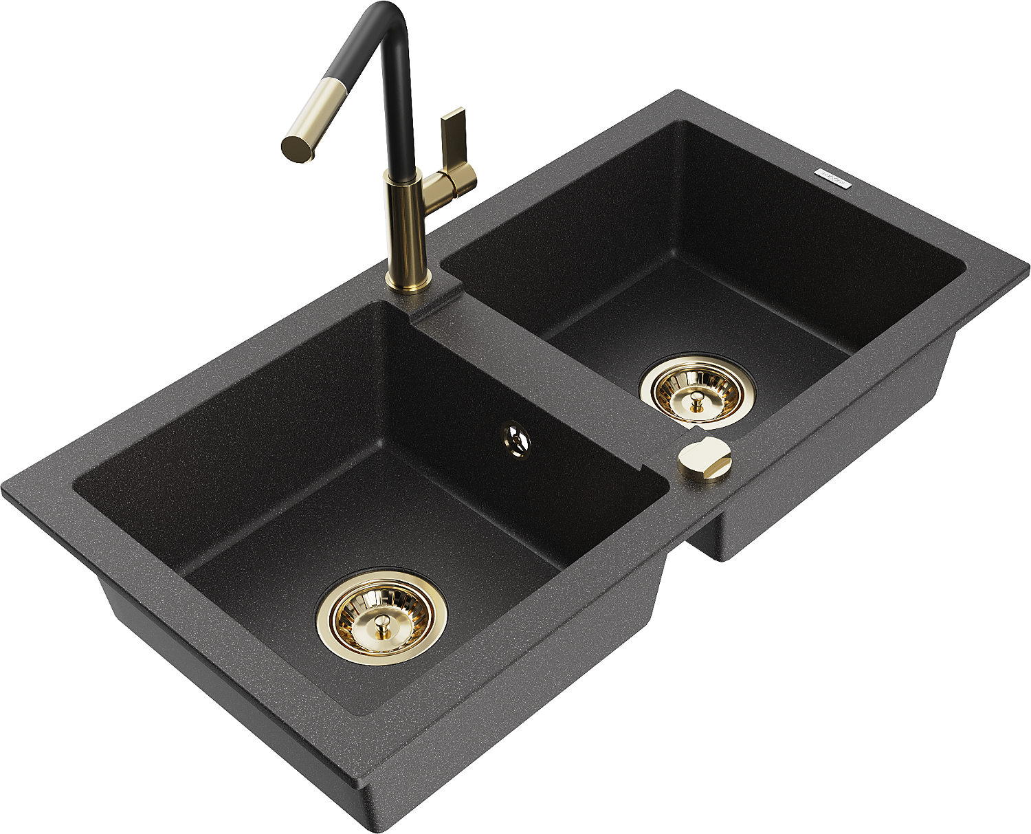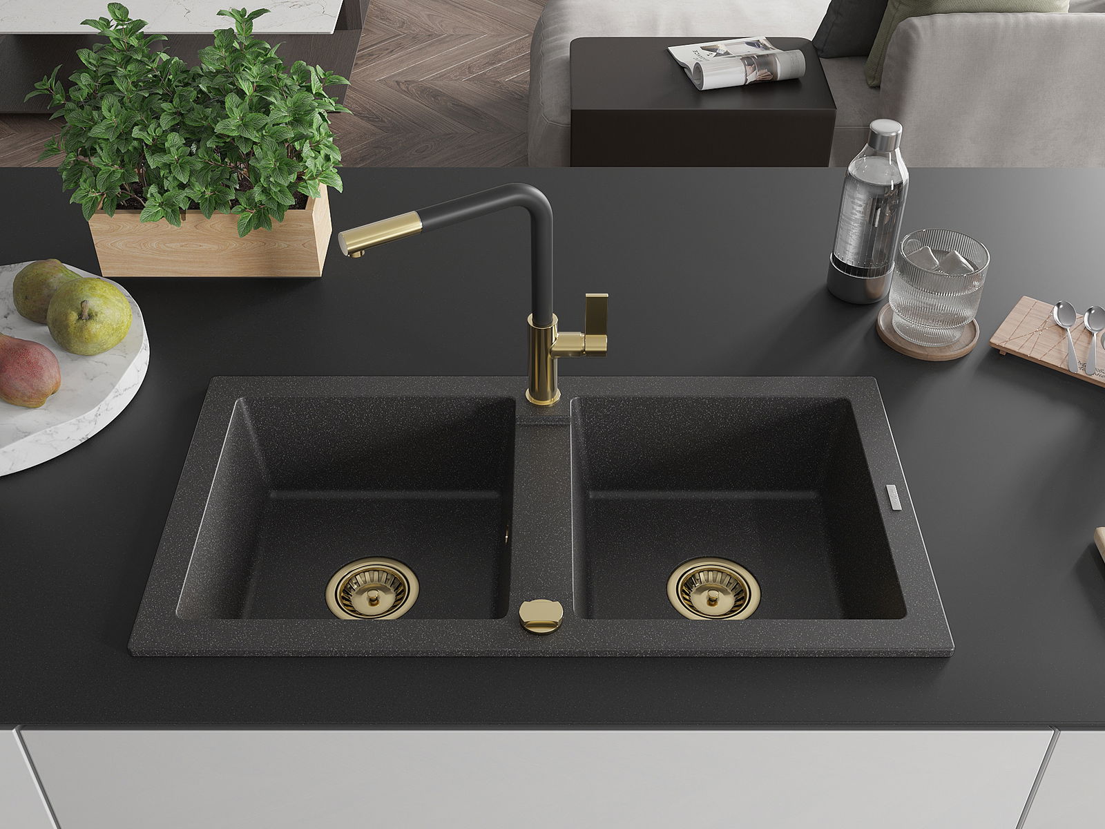 Mexen Mario νεροχύτης γρανίτης 2-θαλάμων με μπαταρία κουζίνας Flora, μαύρος