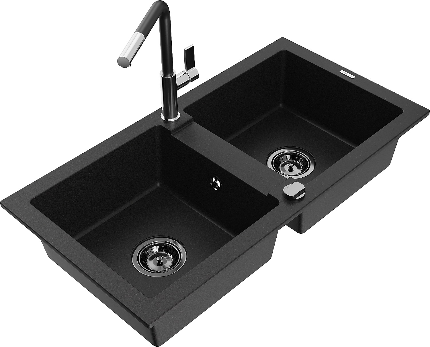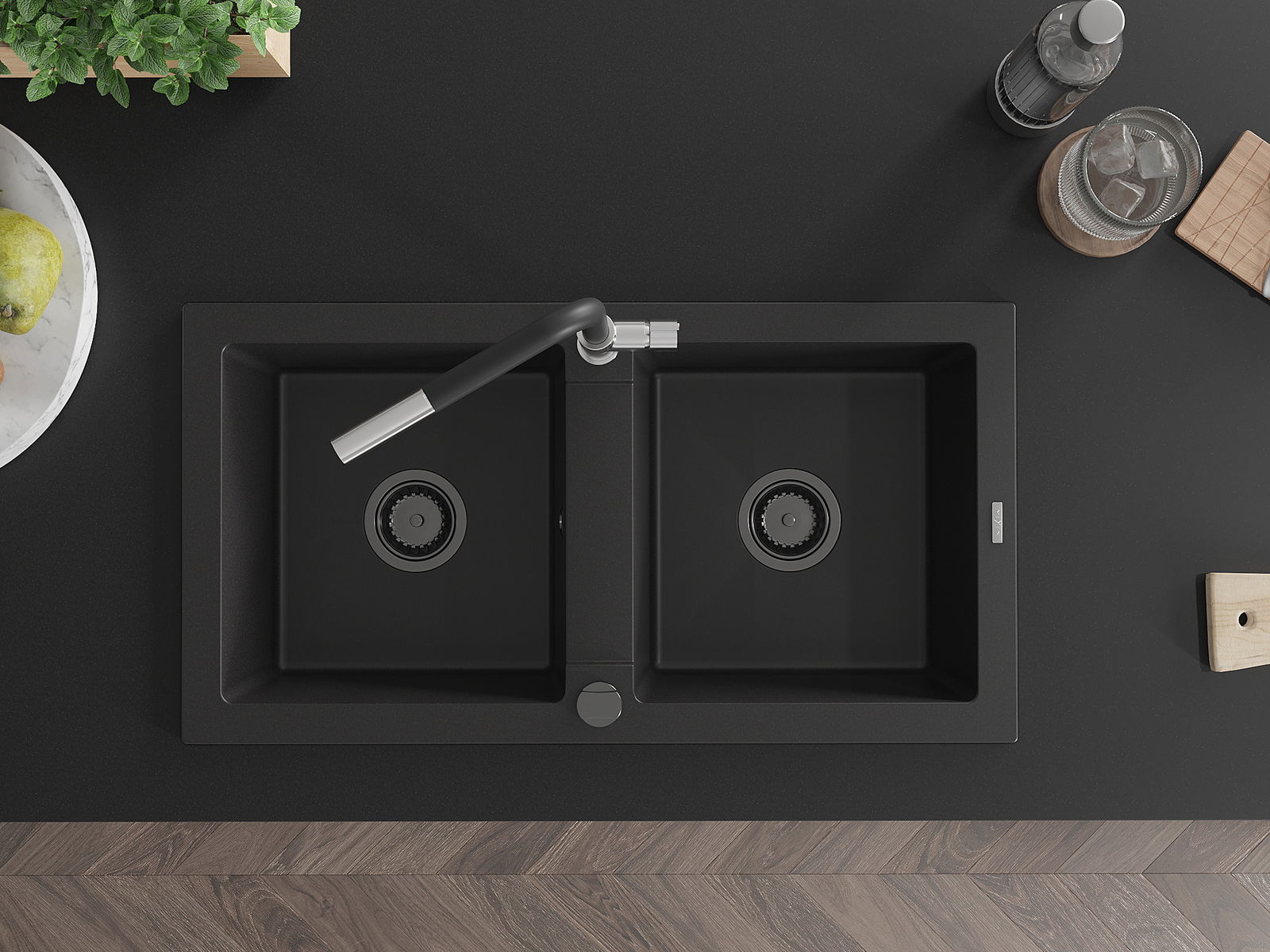 Mexen Mario νεροχύτης γρανίτης 2-θαλάμων με μπαταρία κουζίνας Flora, μαύρο