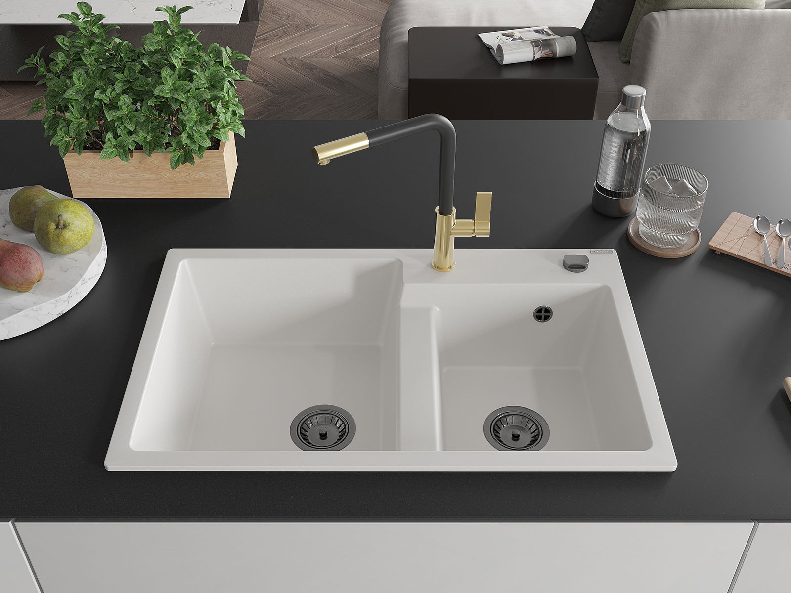 Mexen Tomas νεροχύτης γρανίτης 2-θαλάμων με μπαταρία κουζίνας Flora, λευκός