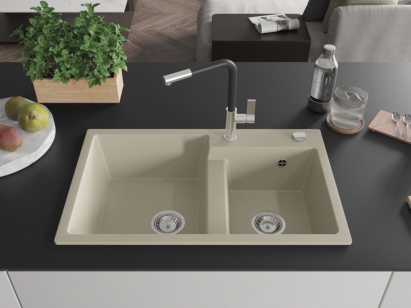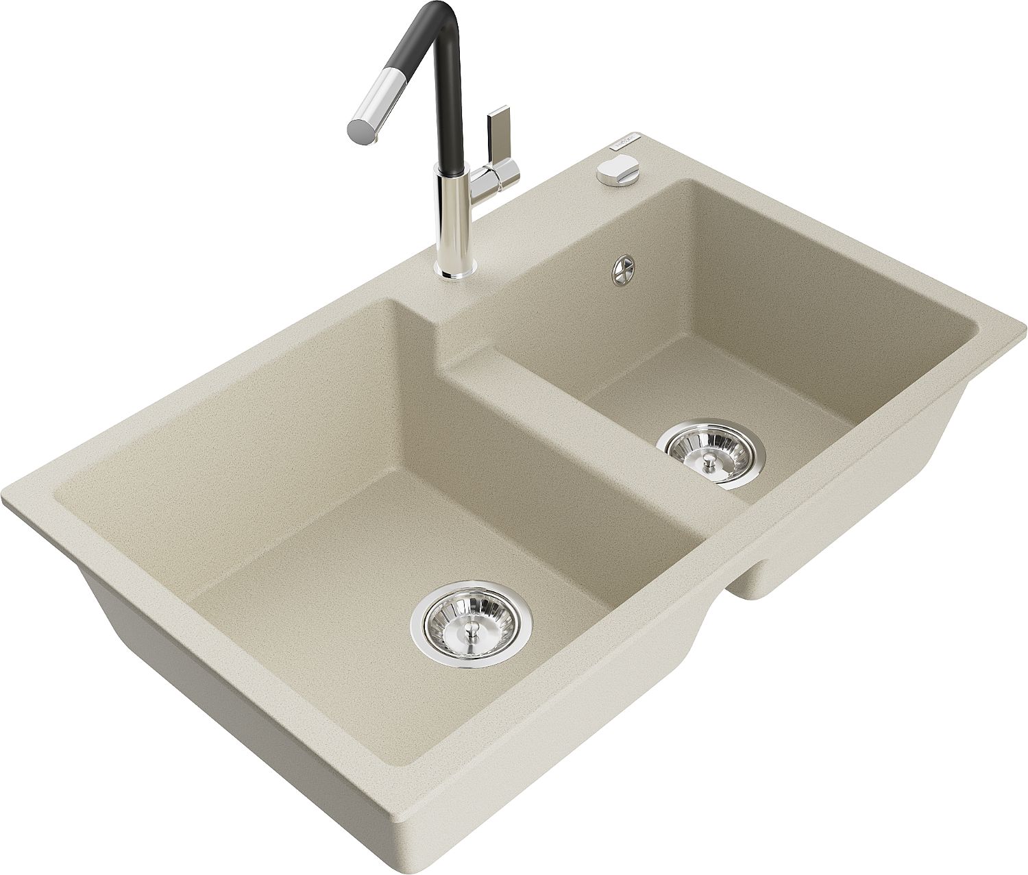 Mexen Tomas νεροχύτης γρανίτης δύο θαλάμων με μπαταρία κουζίνας Flora, μπεζ