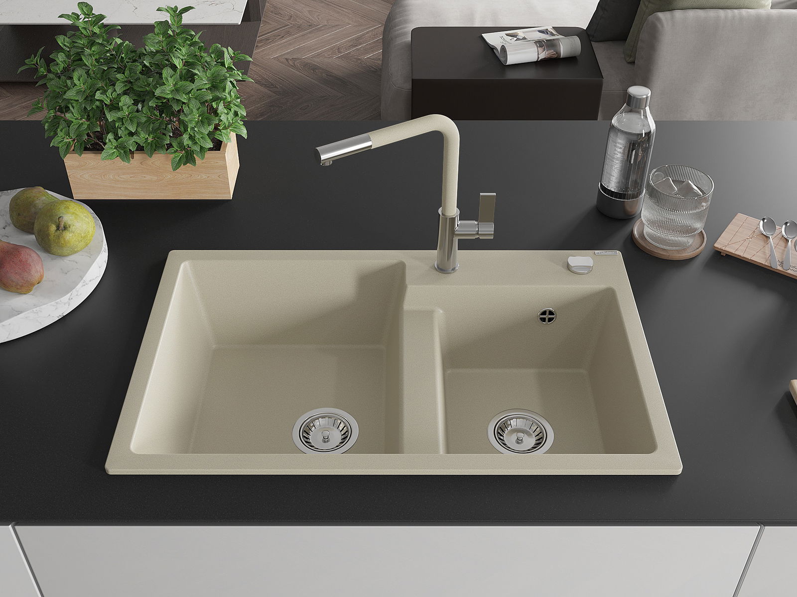 Mexen Tomas νεροχύτης γρανίτη 2-θαλάμων με μπαταρία κουζίνας Flora, μπεζ
