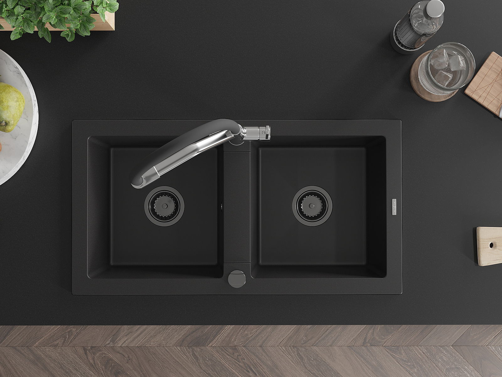 Mexen Mario νεροχύτης γρανίτης δύο θαλάμων με μπαταρία κουζίνας Duo, μαύρος