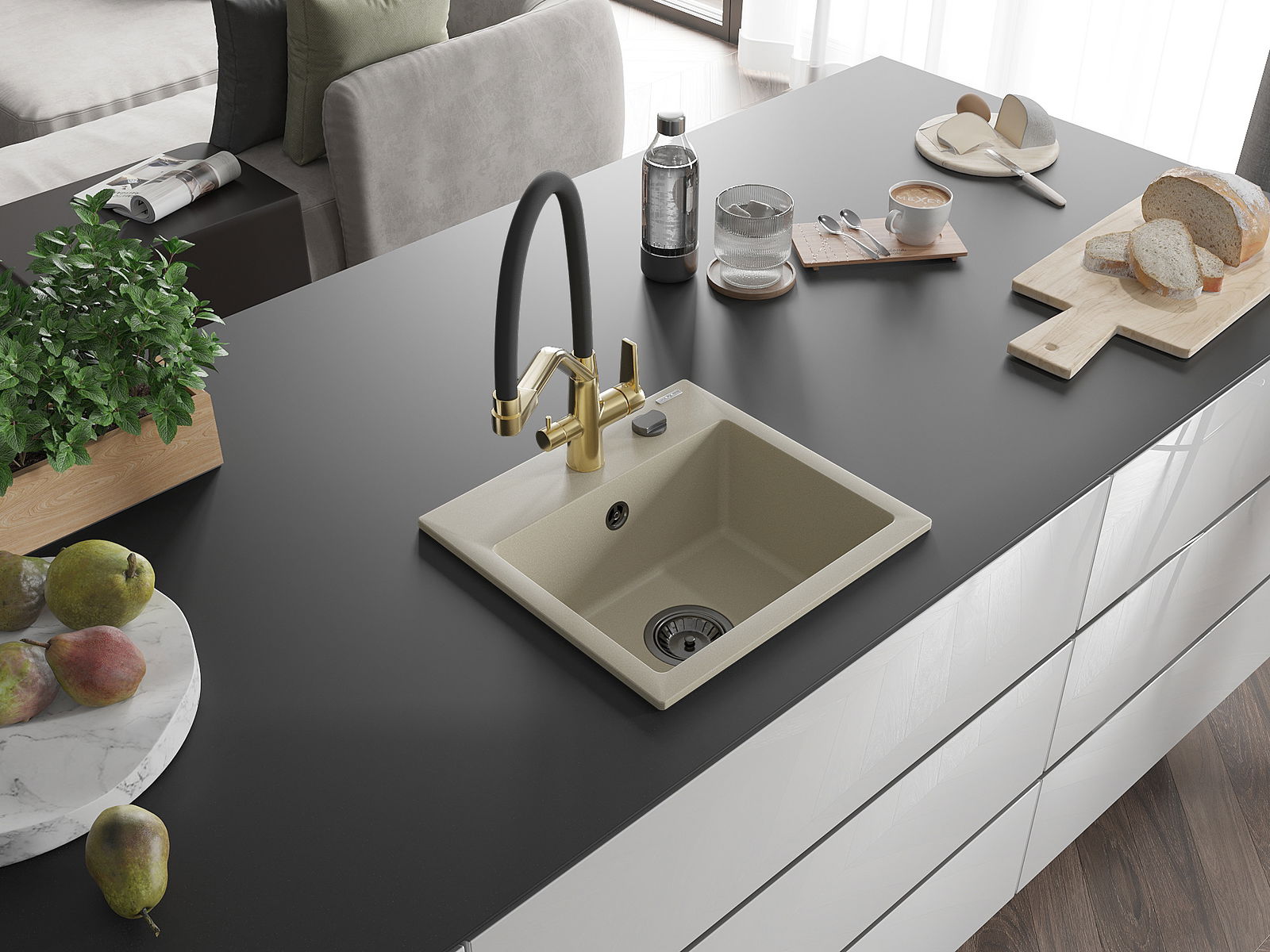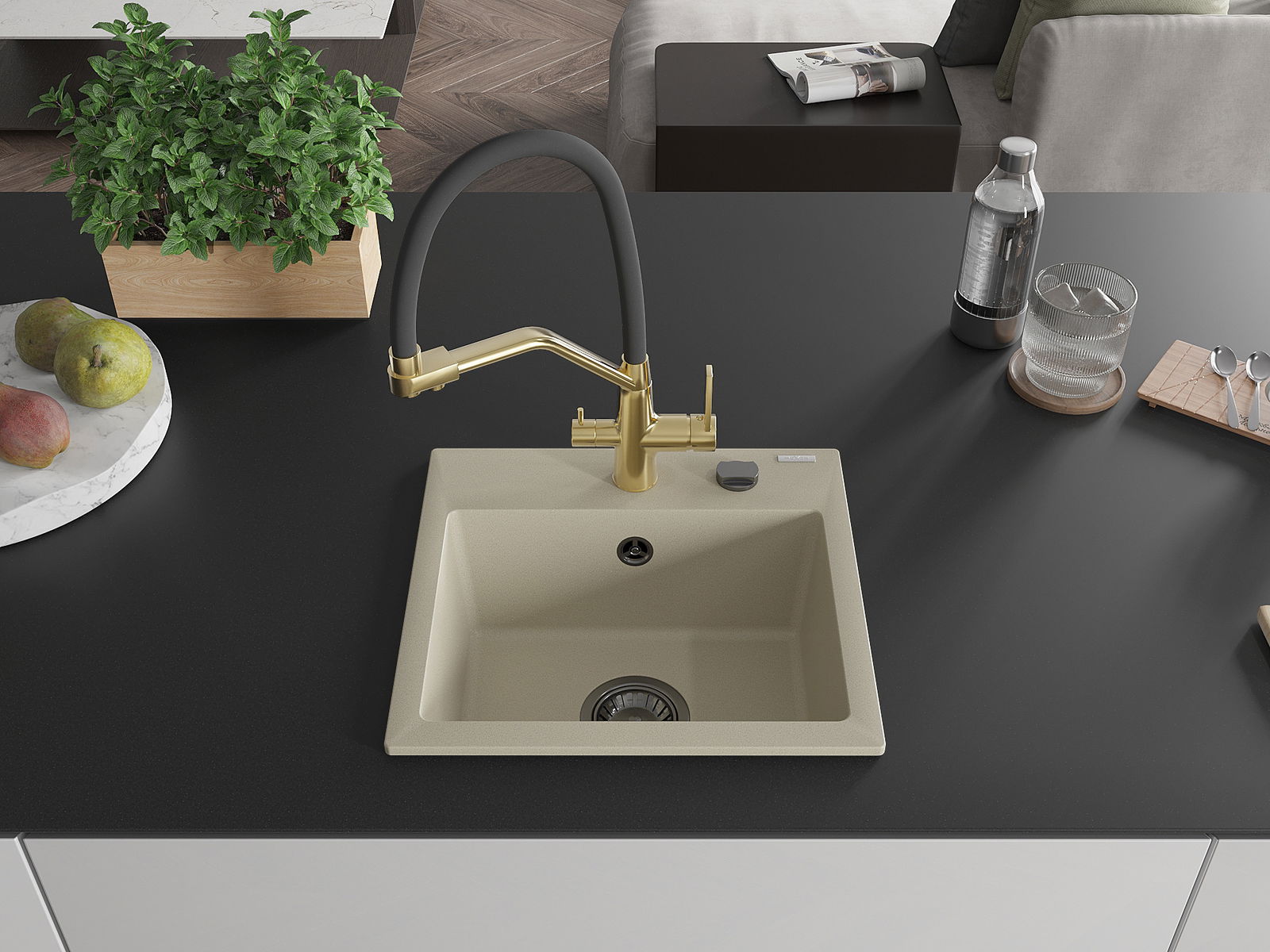 Mexen Milo νεροχύτης γρανίτης 1-θαλάμου με μπαταρία κουζίνας Duo, μπεζ