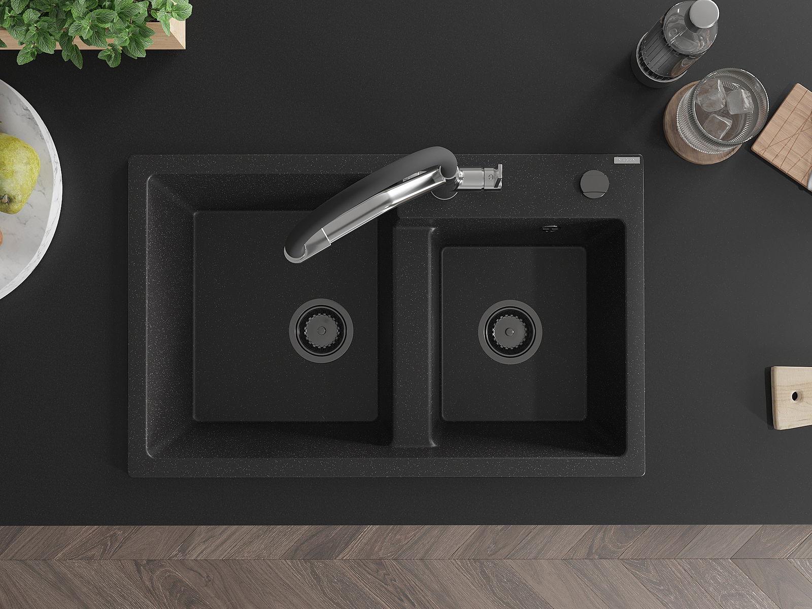 Mexen Tomas Νεροχύτης γρανίτης 2 θάλαμοι με μπαταρία κουζίνας Duo,