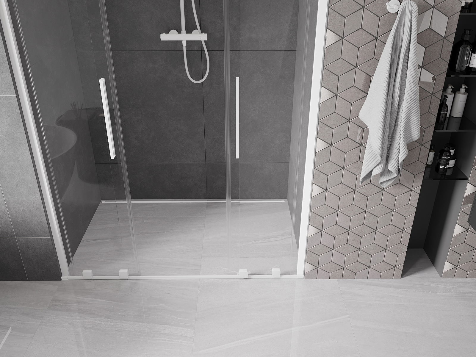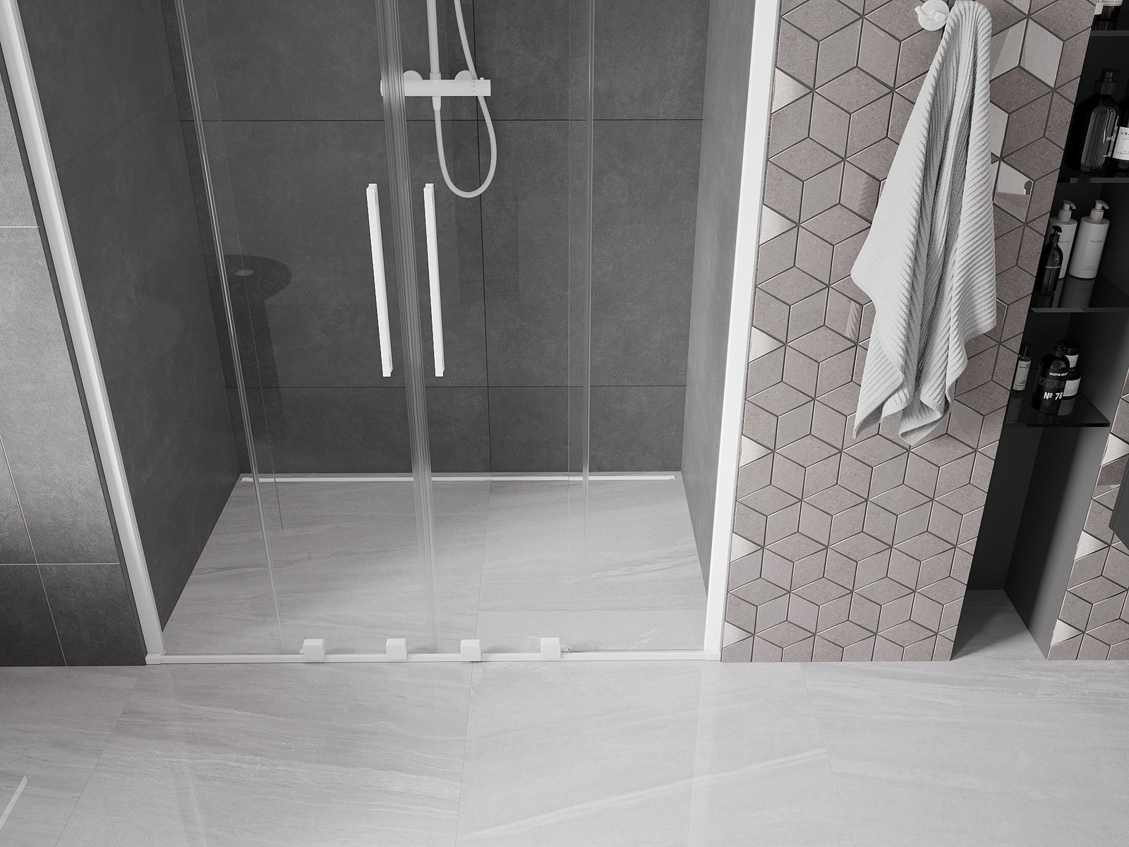 Η πρακτική και άνετη λαβή είναι κατασκευασμένη από ανοξείδωτο ατσάλι. Ο μοντέρνος σχεδιασμός σε συνδυασμό με το φινίρισμα που ταιριάζει με το χρώμα των προφίλ προσδίδει συνολικά μια σύγχρονη και στυλάτη εμφάνιση, υπογραμμίζοντας την αισθητική κάθε μπάνιου.