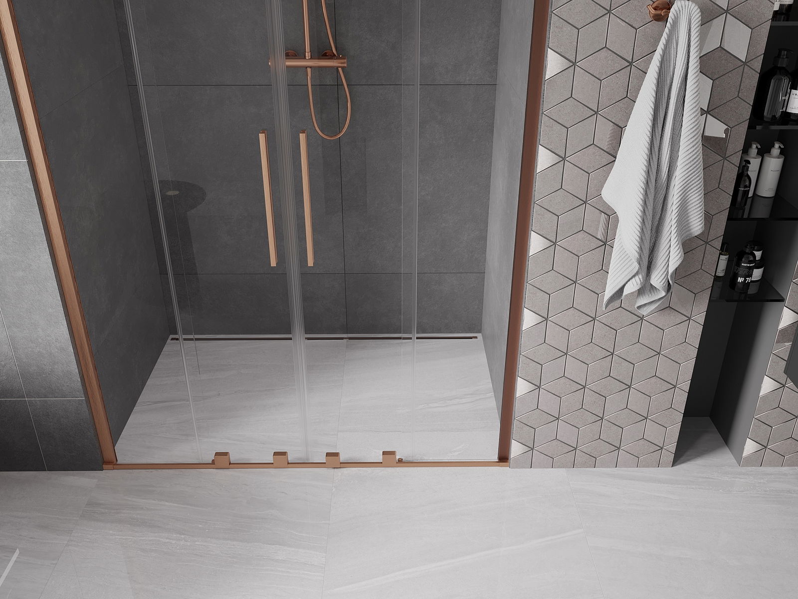 Η πρακτική και άνετη λαβή είναι κατασκευασμένη από ανοξείδωτο ατσάλι. Ο μοντέρνος σχεδιασμός σε συνδυασμό με το φινίρισμα που ταιριάζει με το χρώμα των προφίλ προσδίδει συνολικά μια σύγχρονη και στυλάτη εμφάνιση, υπογραμμίζοντας την αισθητική κάθε μπάνιου.