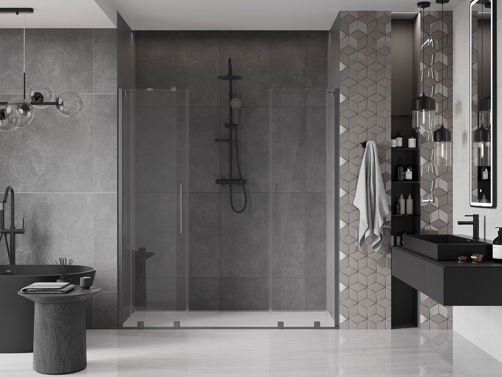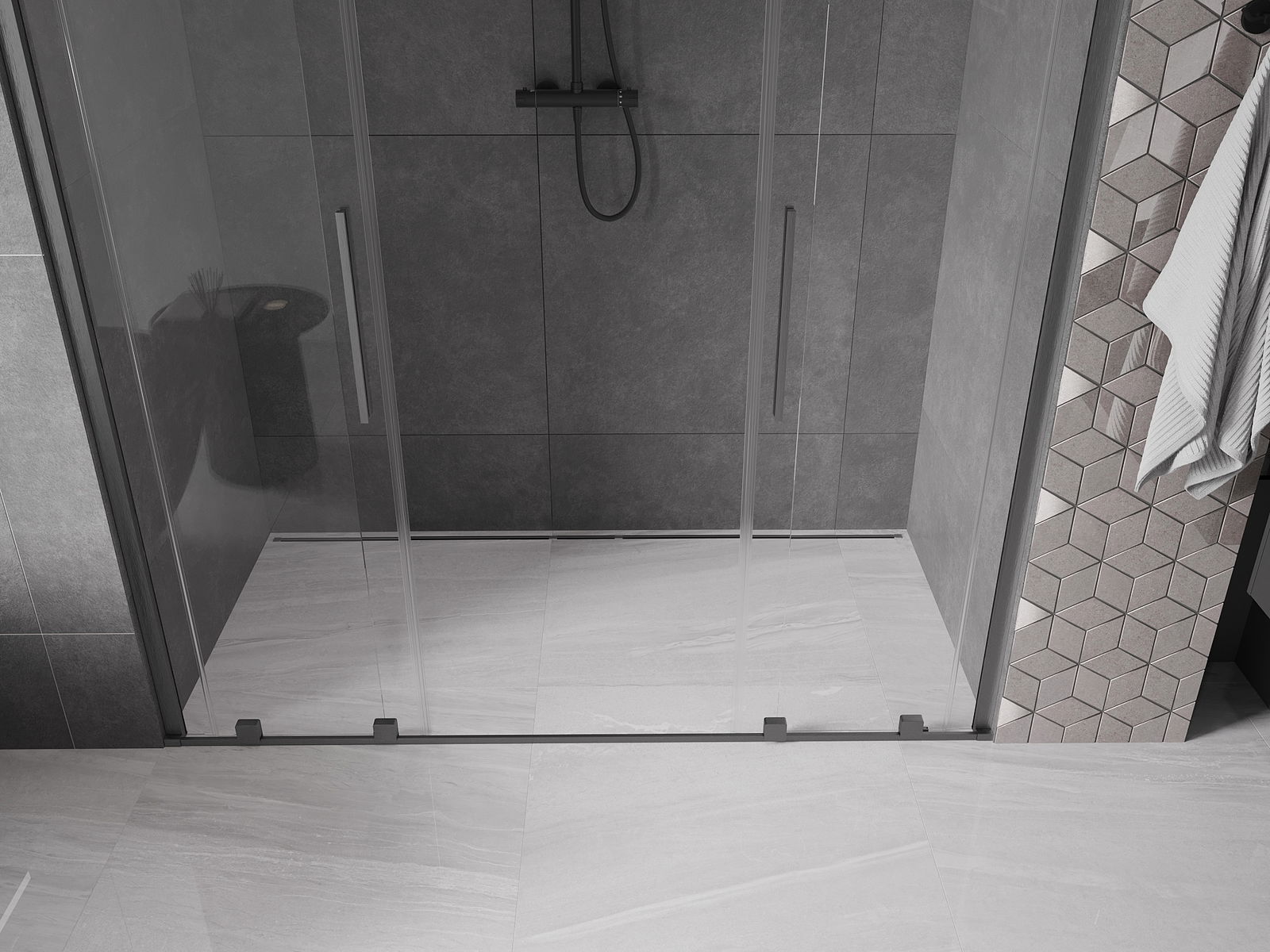 Η πρακτική και άνετη λαβή είναι κατασκευασμένη από ανοξείδωτο ατσάλι. Ο μοντέρνος σχεδιασμός σε συνδυασμό με το φινίρισμα που ταιριάζει με το χρώμα των προφίλ προσδίδει συνολικά μια σύγχρονη και στυλάτη εμφάνιση, υπογραμμίζοντας την αισθητική κάθε μπάνιου.