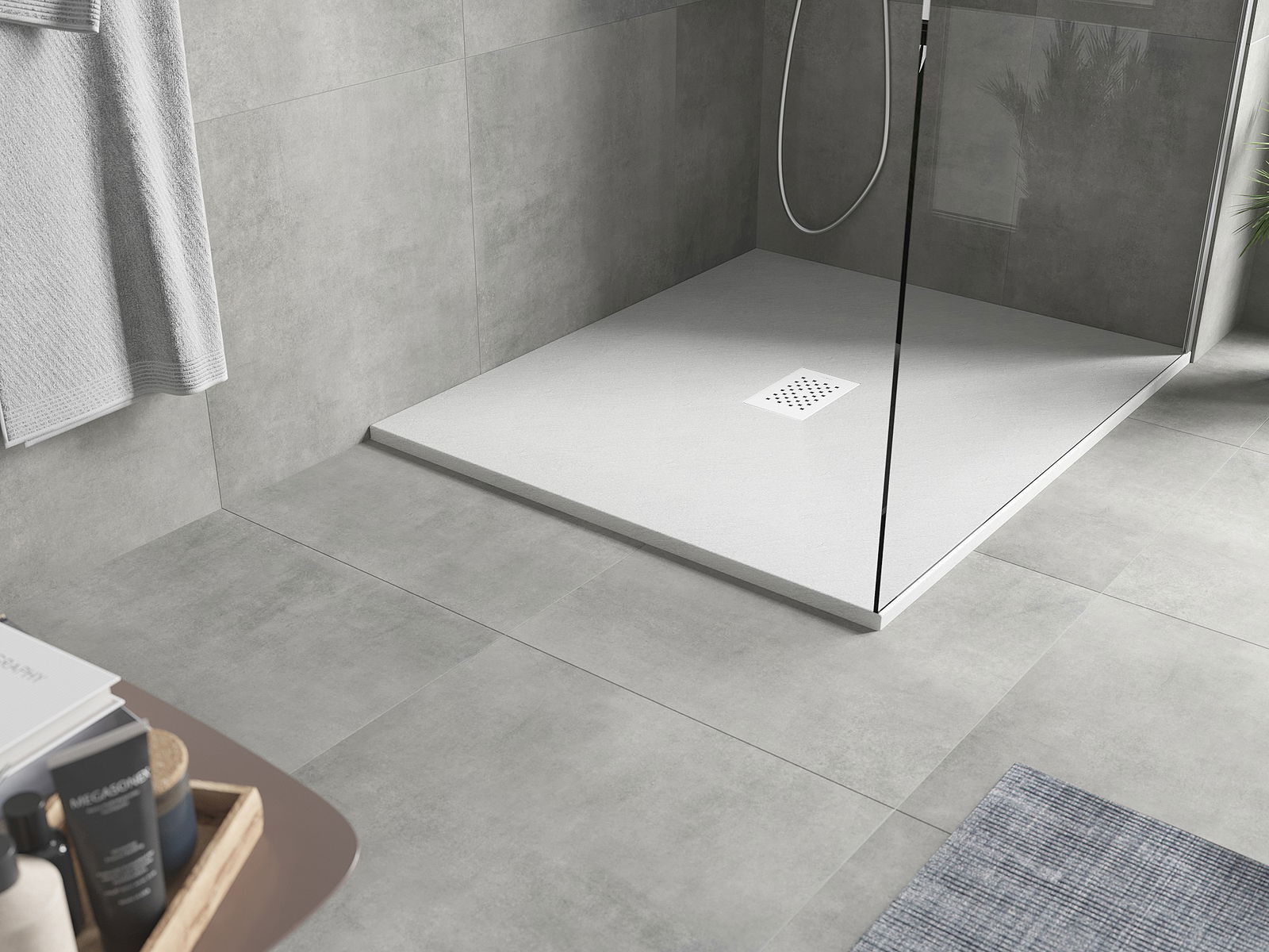 Η επιφάνεια της ντουζιέρας με τη δομή της θυμίζει πέτρα. Αποτελεί έναν εξαιρετικό συνδυασμό φυσικής εμφάνισης με σύγχρονη εσωτερική διαρρύθμιση. Προσθέτει χαρακτήρα, υπογραμμίζει την αισθητική και την κομψότητα της διακόσμησης του μπάνιου και εντυπωσιάζει με τη μορφή της.