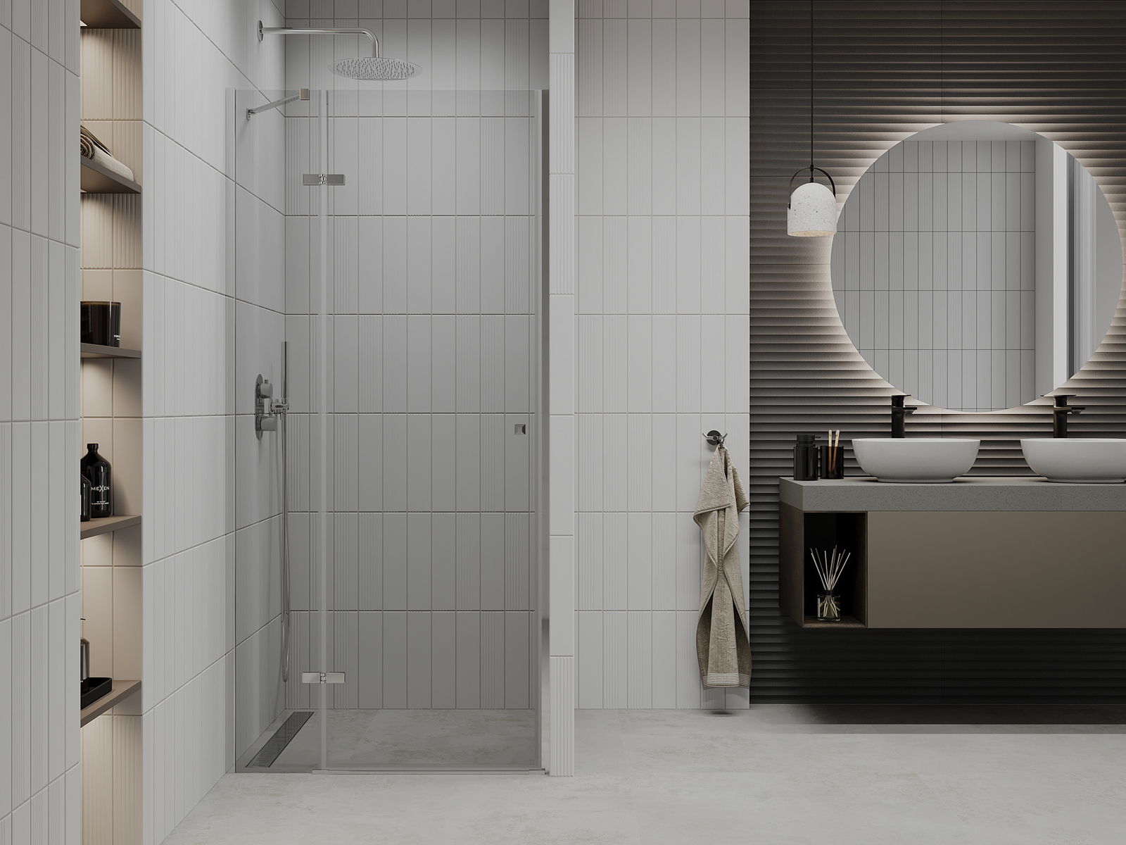 Χάρη στη χρήση ενός καθολικού συστήματος στήριξης, οι πόρτες ντους μπορούν να τοποθετηθούν είτε από τη δεξιά είτε από την αριστερή πλευρά, ανάλογα με τις ανάγκες. Έτσι μπορείτε να σχεδιάσετε με ευκολία ένα ντους προσαρμοσμένο στον χώρο του μπάνιου.