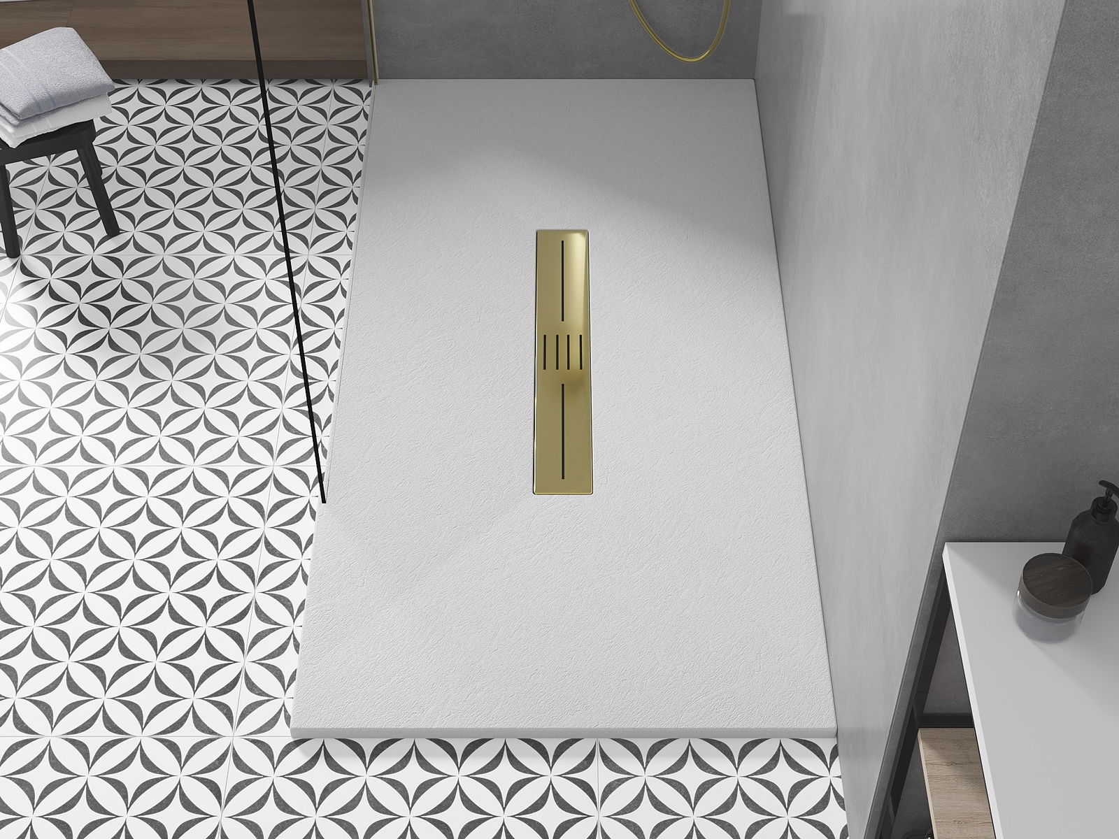 Η επιφάνεια της ντουζιέρας με τη δομή της θυμίζει πέτρα. Αποτελεί έναν εξαιρετικό συνδυασμό φυσικής εμφάνισης με σύγχρονη εσωτερική διαρρύθμιση. Προσθέτει χαρακτήρα, υπογραμμίζει την αισθητική και την κομψότητα της διακόσμησης του μπάνιου και εντυπωσιάζει με τη μορφή της.